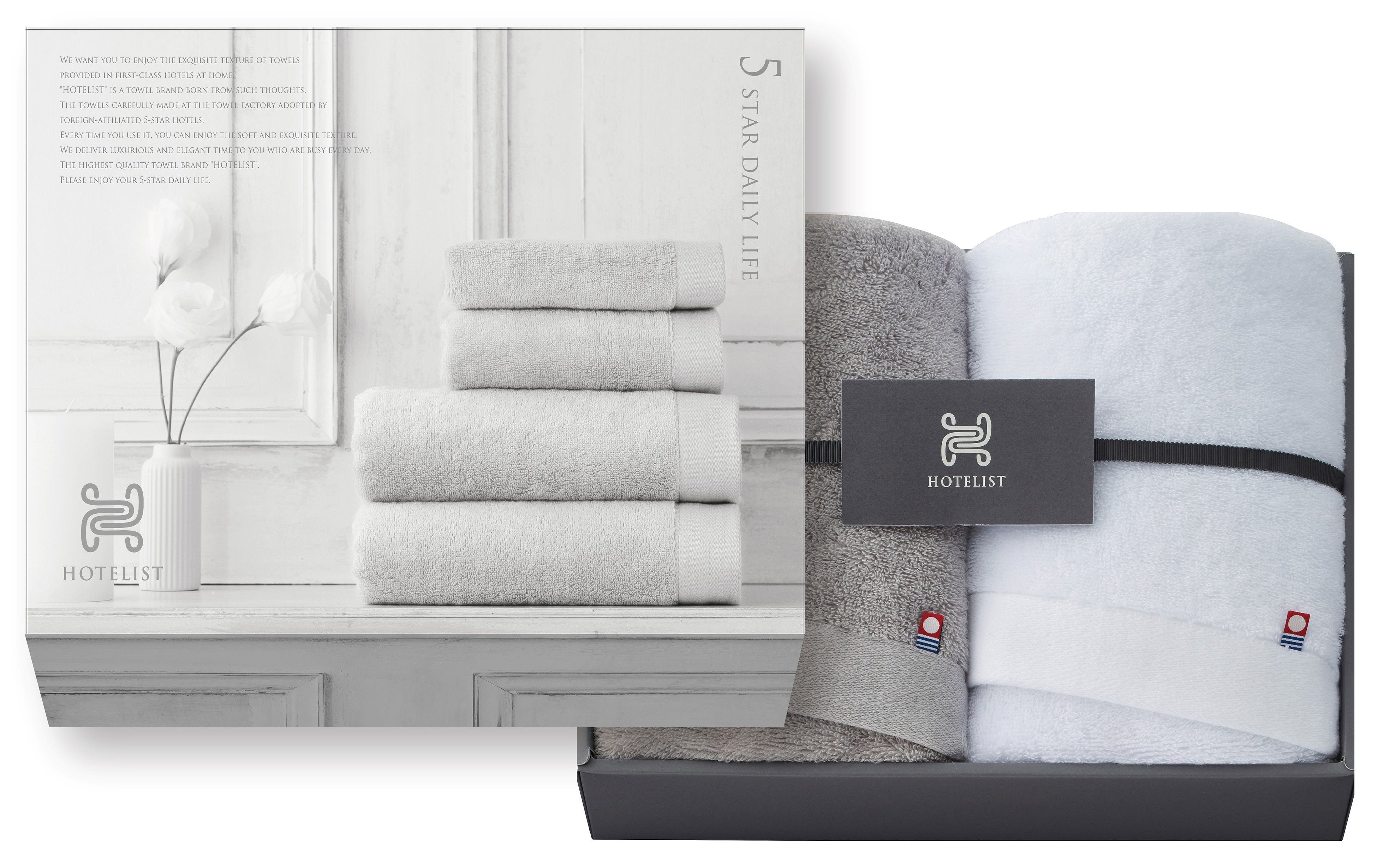 5つ星ホテルで採用されている実績からもタオルの耐久性が高いことはもちろん、繰り返し使用してもその柔らかさが続くことがHOTELISTの大きな特徴です。ラグジュアリーホテルをイメージした、シックで洗練されたデザインの化粧箱は、大切な方への贈り物にもぴったりです。