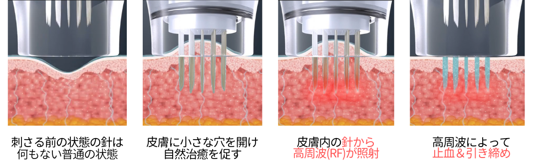 また、皮膚深層の真皮層に直接RFの熱を加えることによって、皮膚の自然治癒能力が活性化されます。創傷治癒の過程を経て、熱影響を受けた線維芽細胞はコラーゲンを再構築し肌質を改善します。