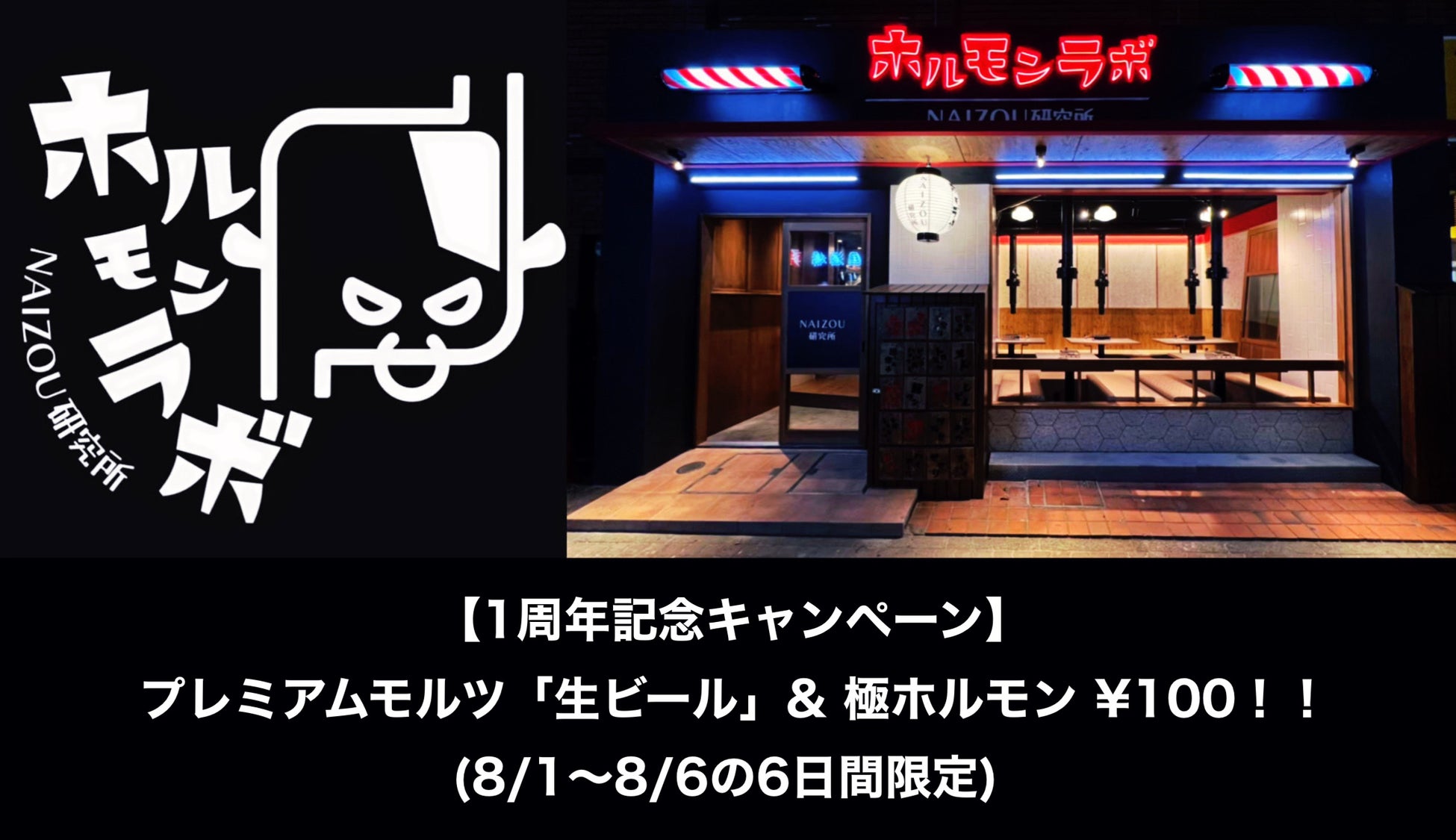 昨年グランドオープンしてから7月28日で1周年を迎える当店。この日を迎えられたのもホルモンラボを愛してくださるお客様のおかげです。愛には愛で恩返しをしたい!ということで8月1日(火)から8月6日(日)の6日間プレミアムモルツ「生ビール」を破格の100円で提供する1周年記念キャンペーンを実施いたします。もちろん、杯数制限はございません!味・香り・口当たり・見た目にも美しい「神泡達人店」としても認定された当店ならではの生ビールをジャンジャンガンガン心ゆくまでお楽しみください!