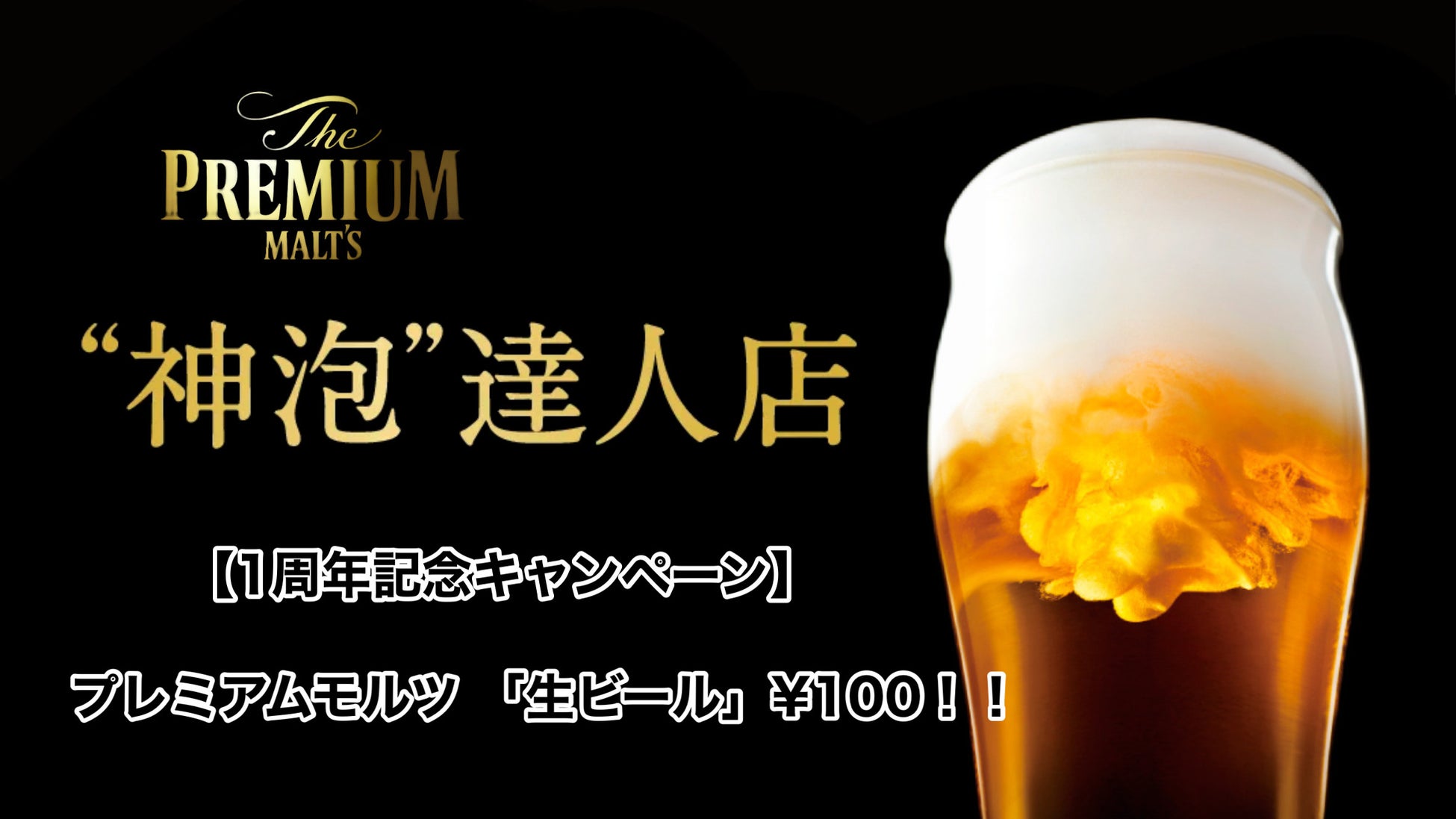 1周年記念キャンペーン①生ビールがお得に飲める!「プレミアムモルツ」¥100!!