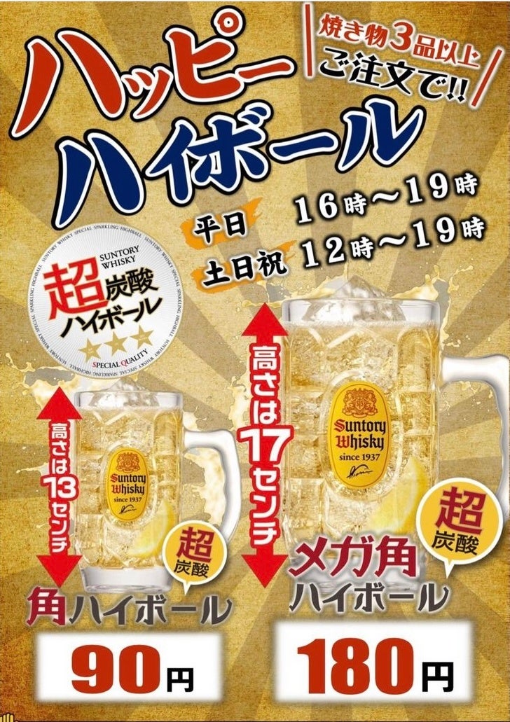 営業開始(平日16時・土日祝12時)から19時まで、店舗自慢の「ハイボール」がお得に飲める「ハッピーハイボール」を毎日開催。「角ハイボール」が1杯90円、メガサイズの「メガ角ハイボール」は1杯180円で提供します。通常(瓶の炭酸水)の1.5倍のガス圧の炭酸水がつくれ、設置店舗が限られる業務用サーバー「ゼウスタワー」だからこそできる「凍る直前1℃の強炭酸水」と「国産ウイスキーサントリー角瓶」で作るハイボールは、決して家庭では味わえない完璧な1杯。キンキンに冷え、シュワっと炭酸が強烈に抜けていき、爽快に飲めるハイボールをご提供しています。(1周年誕生祭イベント期間中(8月1日~6日)は実施いたしませんのでご了承ください。)