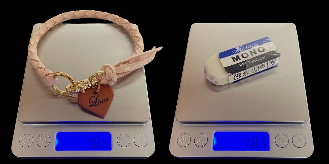 そこで本商品では、使用する金具を最小限に小さく軽くすることで、首輪の総重量を約18g程度にすることができました。