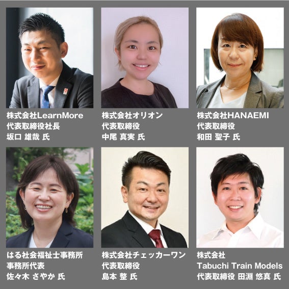 株式会社LearnMore 代表取締役社長 坂口 雄哉 氏、株式会社オリオン 代表取締役 中尾 真実 氏、株式会社HANAEMI 代表取締役 和田 聖子 氏、はる社会福祉士事務所代表 佐々木 さやか 氏、株式会社チェッカーワン 代表取締役 島本 整 氏、株式会社Tabuchi Train Models 代表取締役 田淵 悠真 氏(以上6名、順不同)