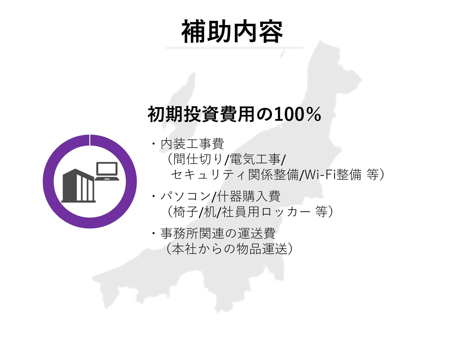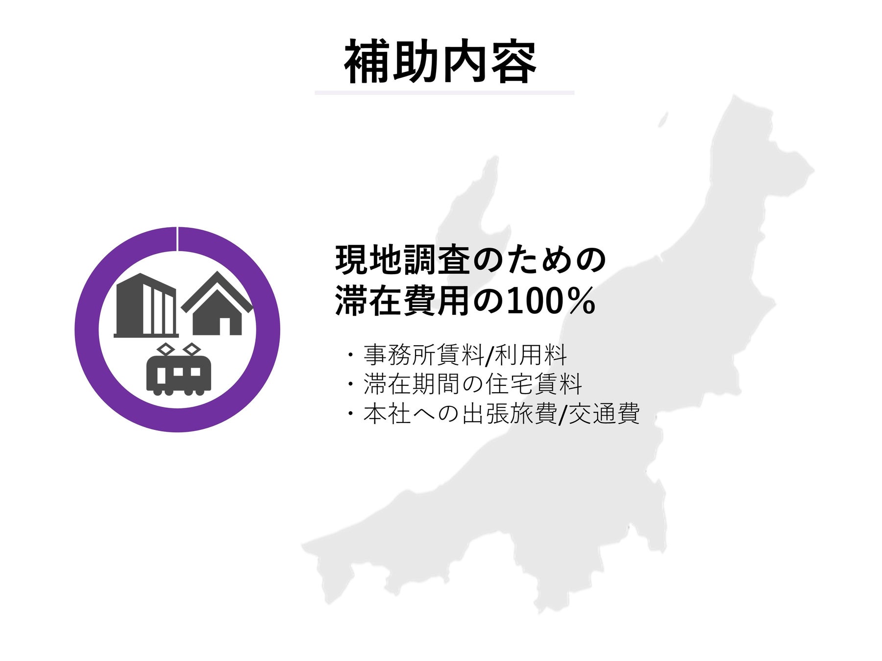 事務所賃料や滞在期間の住宅賃料、本社への交通費が補助されます。