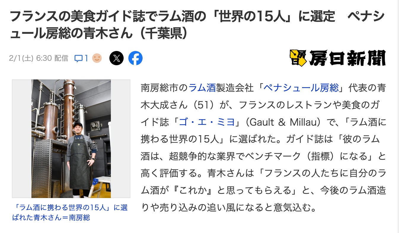 ペナシュール房総では、自社農園「Kibilab.FARM(きびラボファーム)」で生産するサトウキビを使用したアグリコールラムをはじめ、日本独自の製糖の過程で得られるモラセスを原材料としたトラディショナルラムやカリブの一部地域でしか造られていないハイエステルラムなど、小規模ながらも様々なタイプのラム酒の製造を行っており、IWSC(International Wine and Spirit Competition)でのGOLD受賞やフランスのGault et Millauで「ラムに携わる世界の15人」として紹介されるなど世界的にも評価をいただいています。