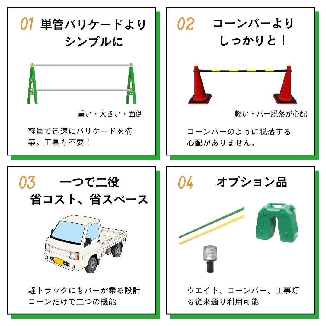 また、単管バリケードは鉄製の単管を、カラーコーンはコーンバーを必要とするため、益々コストがかさみ、管理も煩雑になります。