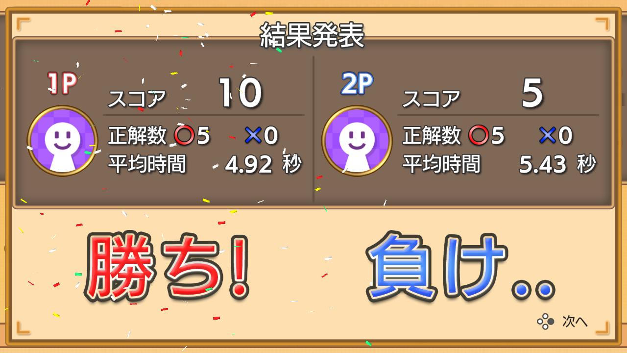 対戦モードでは、2人でクイズ対決をする事ができます。クイズ終了後は結果発表画面にて正解数などを表示。ひとりモード同様におさらい画面も出るので、一緒に問題の回答を確認することもできます。※ 配信開始時点ではオフラインでの2人プレイとなります。オンライン対戦モードは今後のアップデートにて実装を予定しております。