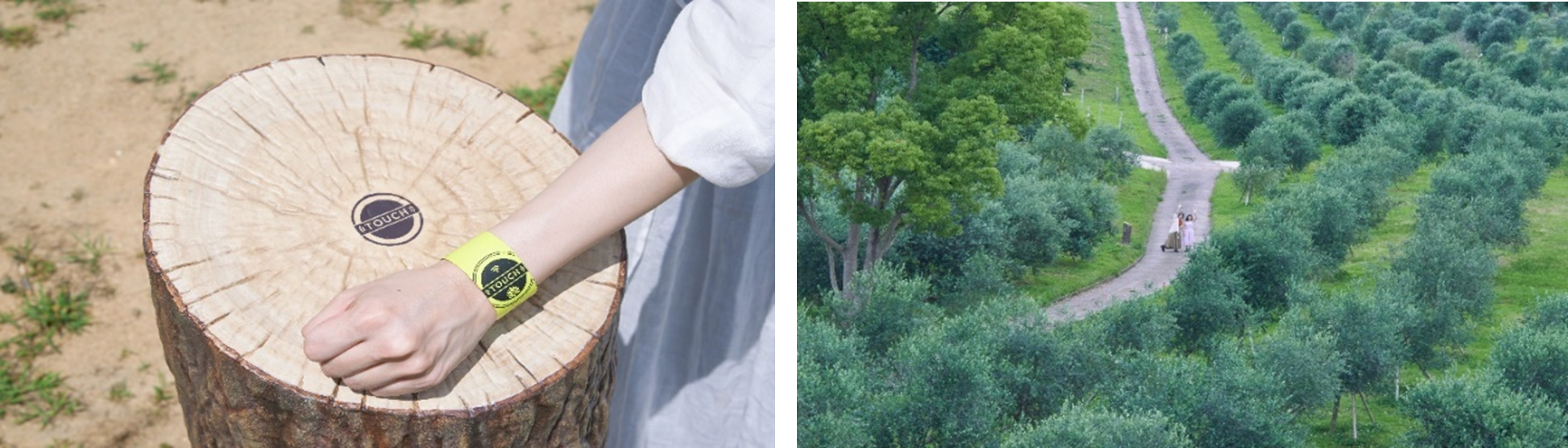 施設内の撮影スポットにあるNFC読取リーダーに、チェックイン時にお渡しするリストバンドをかざすと、お客さま自身では撮影できない場所からプロ仕様の構図で映える写真が自動で撮影ができます。撮影した写真は、スマートフォンでの確認やダウンロードができます。