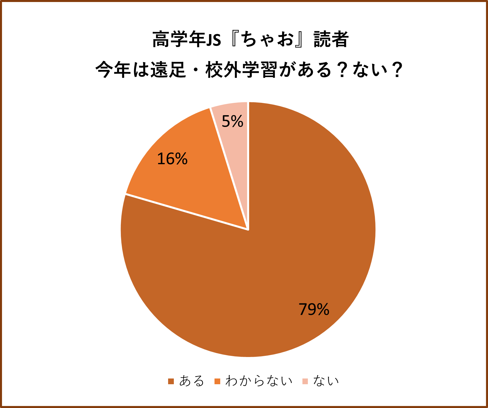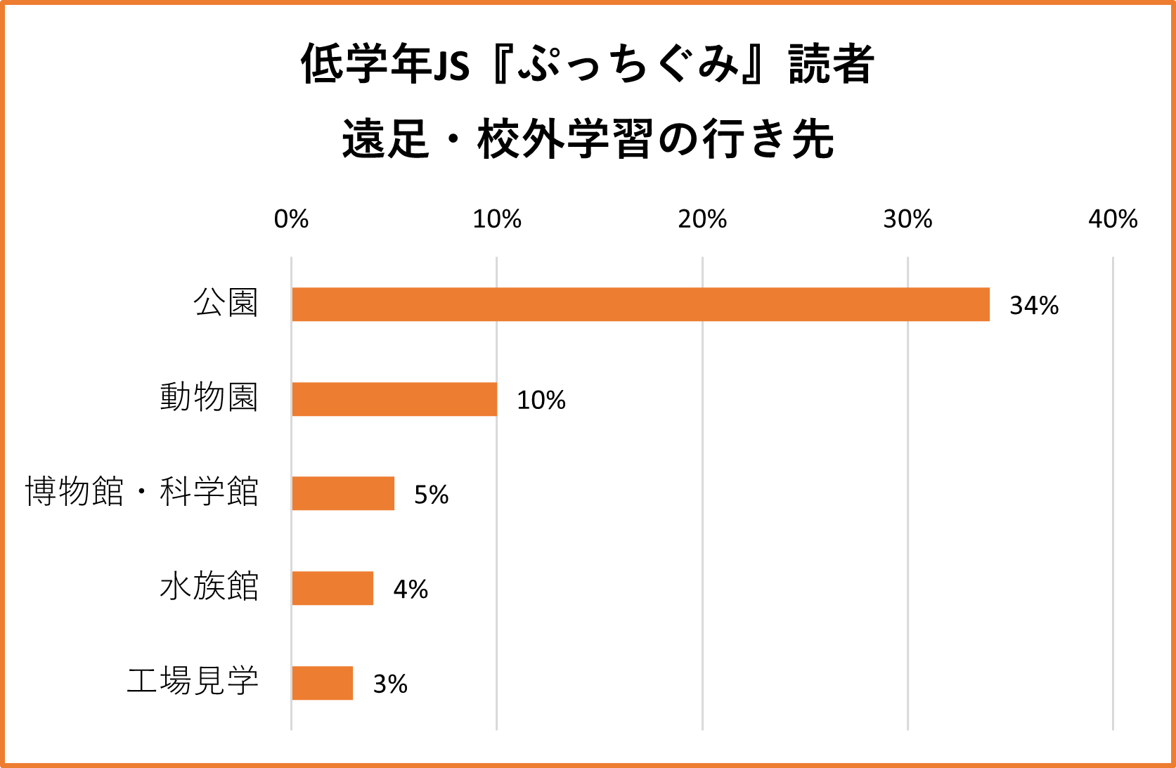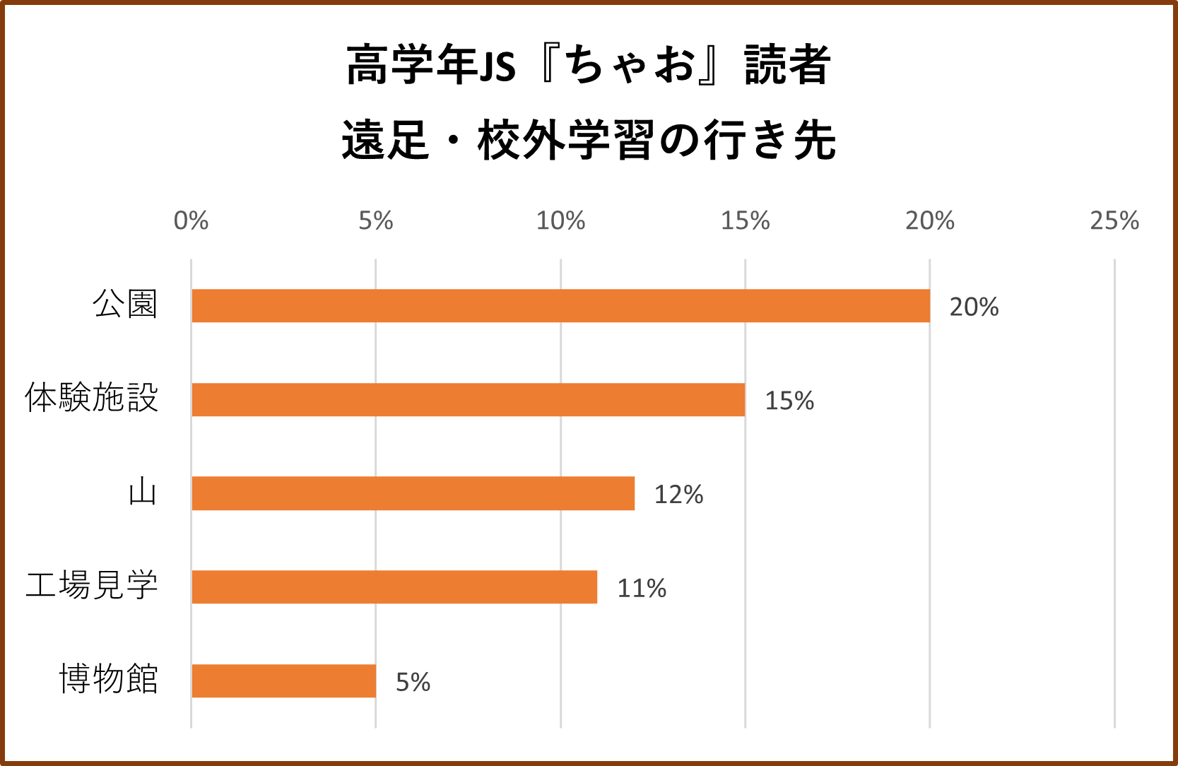 「今年は遠足や校外学習がある?」という質問に対して、『ぷっちぐみ』読者の約6割、『ちゃお』読者の約8割が「ある」と回答しました。近年は新型コロナウイルス感染症の影響で遠足・校外学習が中止となることも多くありましたが、今回の調査では行動制限の緩和に伴い、遠足・校外学習実施が多数派となりました。行き先では、『ぷっちぐみ』読者は公園が圧倒的に多く3割以上を占めました。『ちゃお』読者でも公園が20%で1位となる一方、体験施設や山、工場見学などに行くJSもそれぞれ1割以上いました。