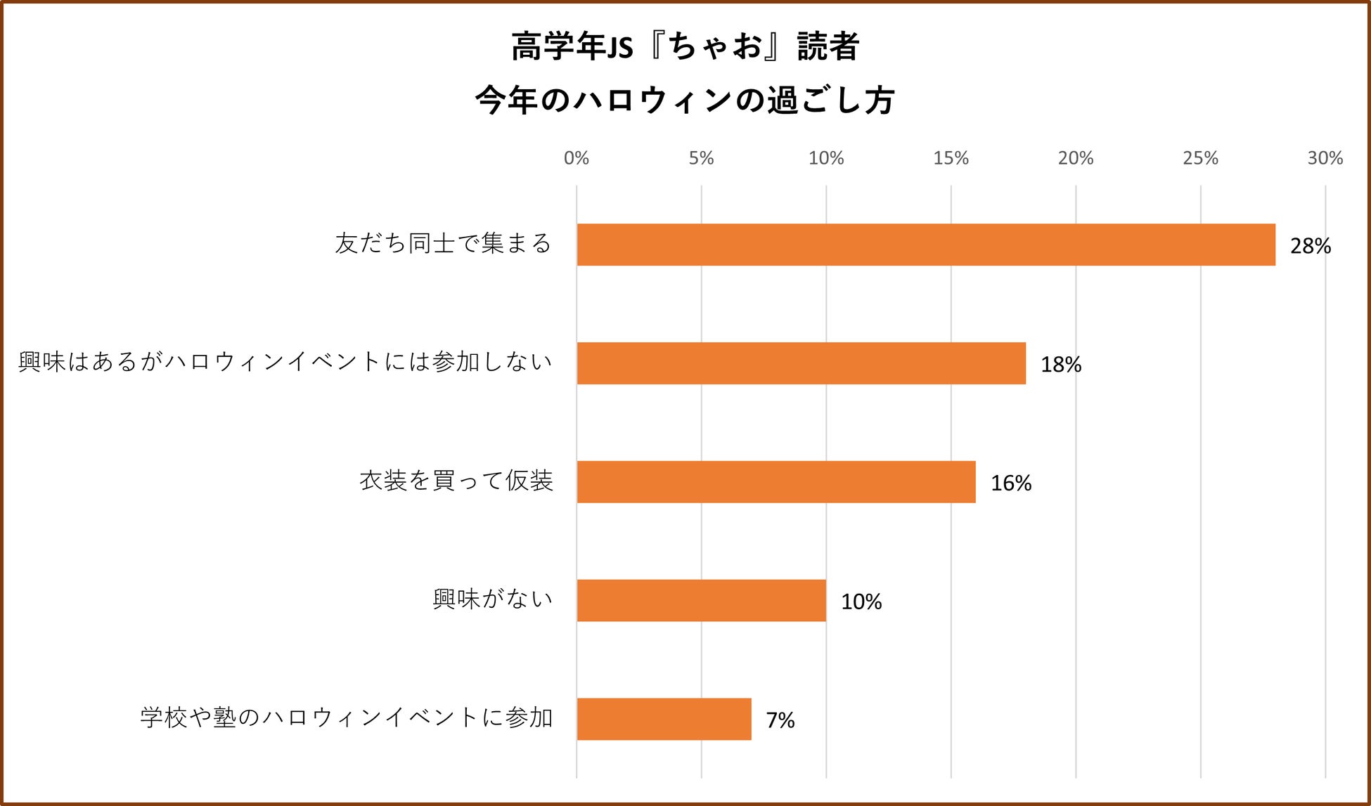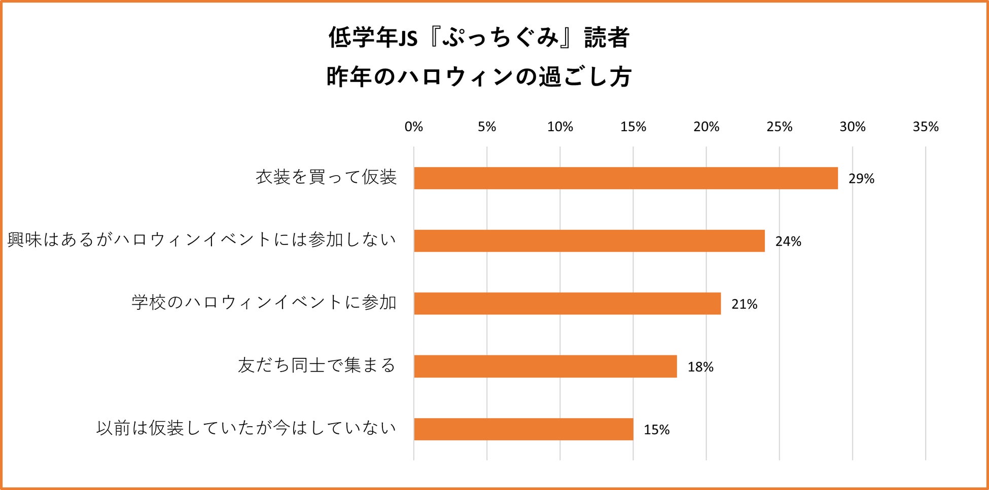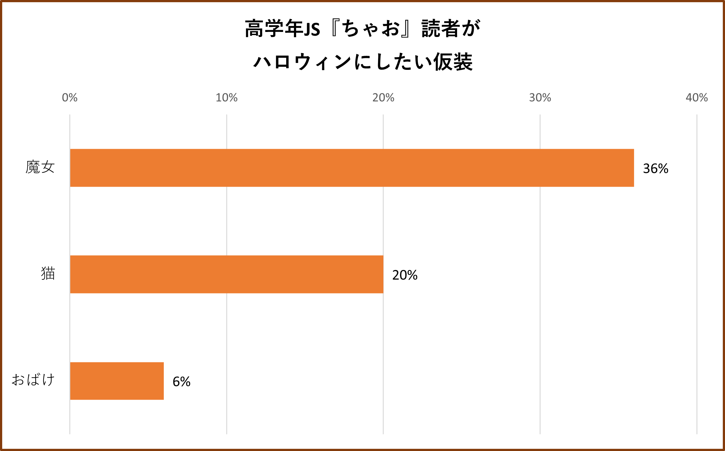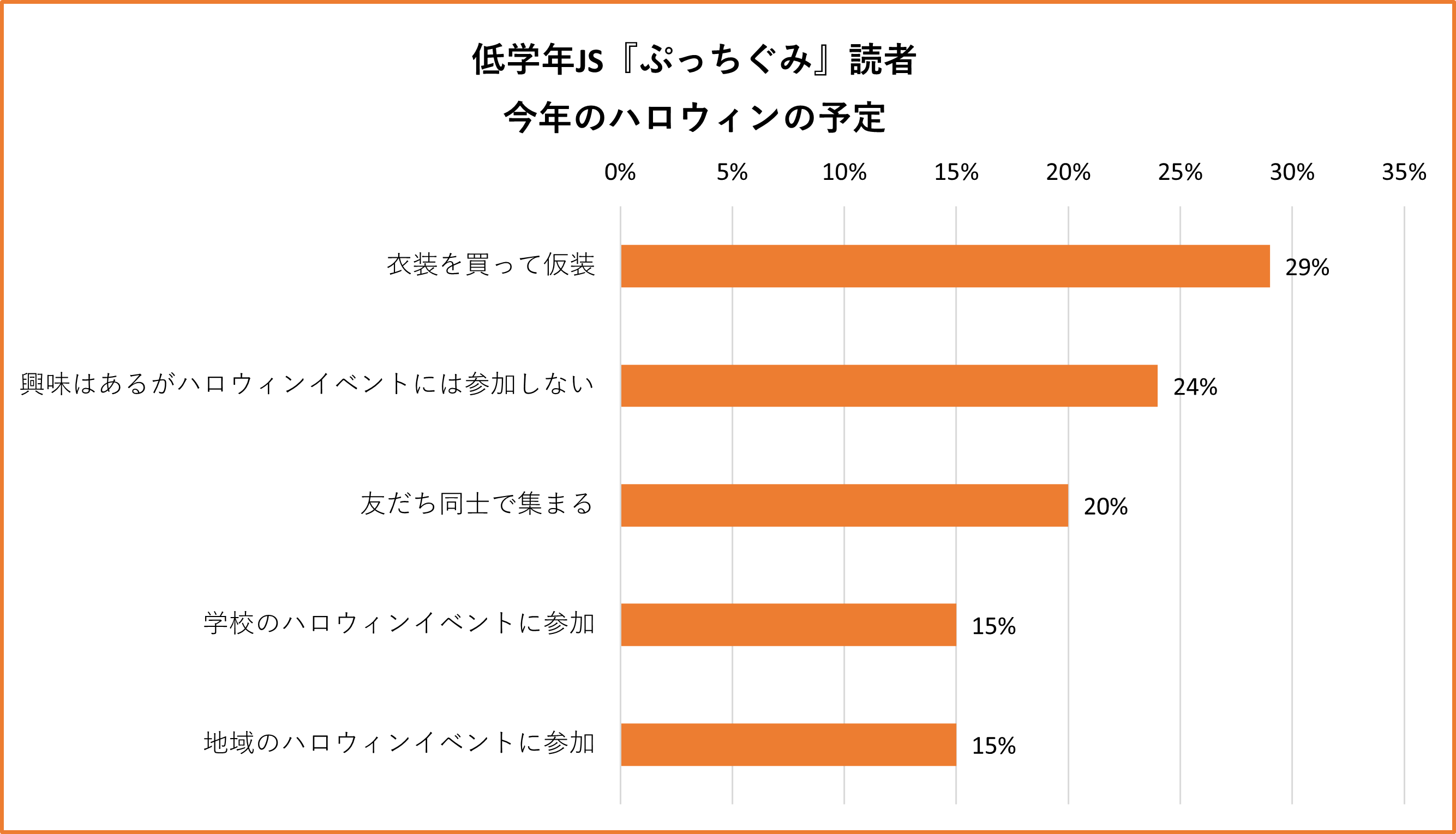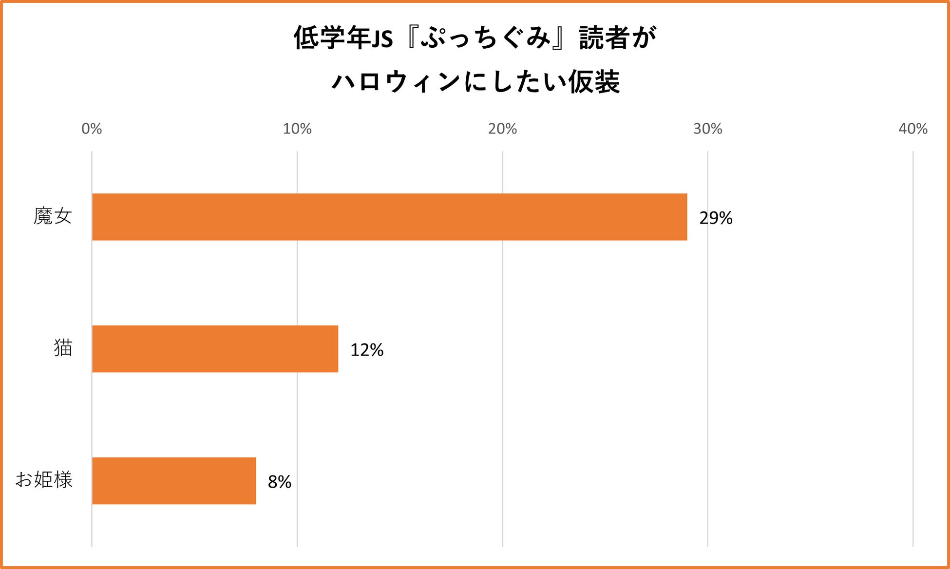 「ハロウィンに仮装するとしたら、何の仮装をしたい?」と尋ねたところ、1位は『ぷっちぐみ』『ちゃお』読者ともに「魔女」で、いずれも2位に15ポイント以上の差をつけていました。2位には「猫」が続き、ハロウィンのシンボルのなかでもかわいくなれる仮装が人気を集めました。