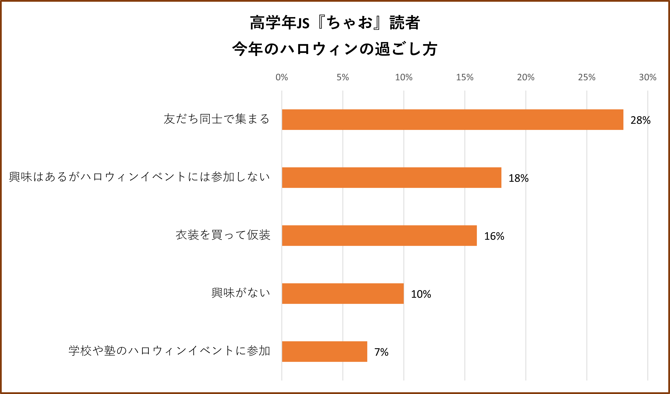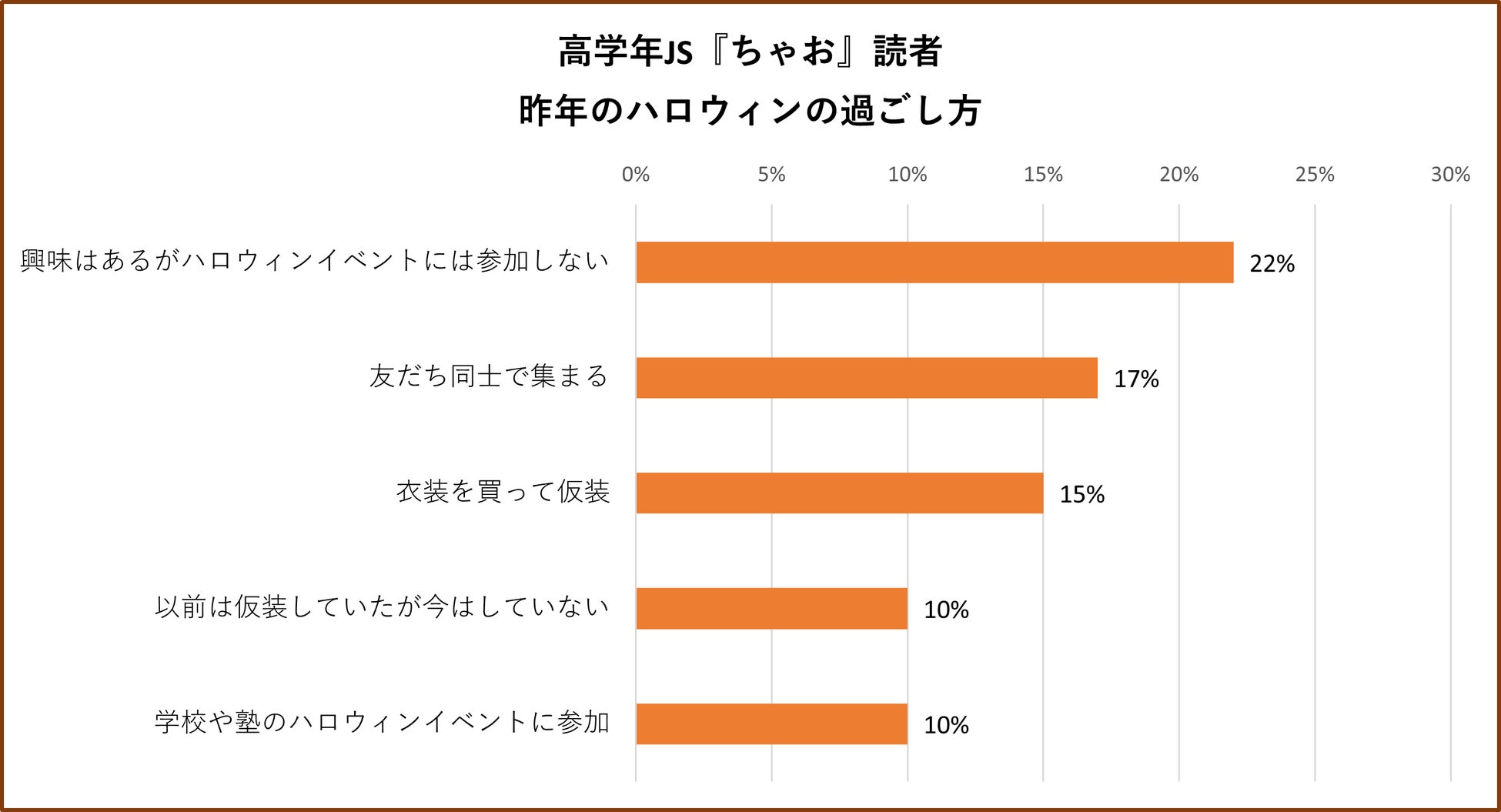 ハロウィンの昨年の過ごし方と今年の予定を尋ねたところ、『ぷっちぐみ』読者は「衣装を買って仮装」「(興味はあるが)参加しない」の上位順は変わらず、過ごし方に大きな変化は見られませんでした。一方、『ちゃお』読者は昨年最も多かった「(興味はあるが)参加しない」が減り、「友だち同士で集まる」が10ポイント以上増加しトップになりました。昨年はコロナ禍もあり、イベント参加を控える動きが見られましたが、今年は行動制限緩和の影響もあってか、友だち同士でハロウィンを楽しもうと計画するJSが増加していると考えられます。