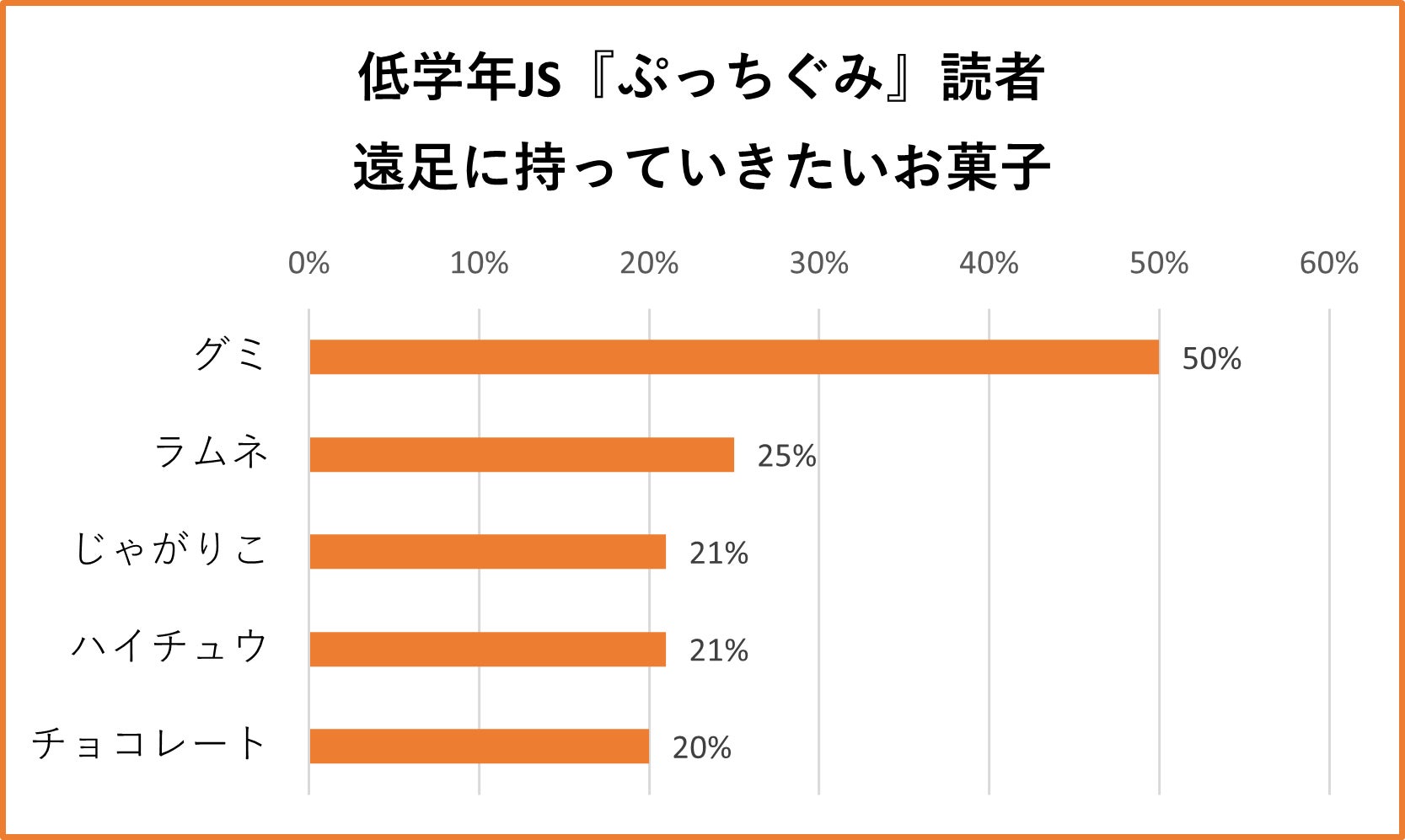 『ぷっちぐみ』読者は、グミ大好き世代! 普段の生活で好きなお菓子No1は、ポテトチップス(2位にグミ)ですが、遠足に持って行くには食べやすく、みんなに分ける事もできるグミが人気のようです。また、じゃがりこは、外での食べやすさ、フレーバーの多彩さで、3位に入っています。6位以下では、キャンディ、ポッキー、そしてうまい棒もランクインしています。また、男梅も隠れた人気があるようです。(『ぷっちぐみ』編集部)