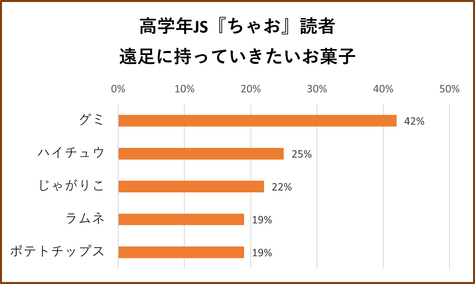 「遠足に持っていきたいお菓子」を選んでもらったところ、『ぷっちぐみ』『ちゃお』読者いずれも「グミ」が他を引き離して1位となりました。特に『ぷっちぐみ』読者は半数がグミを選択していました。続いて低学年では「ラムネ」、高学年では「ハイチュウ」と、気軽に食べられるお菓子が上位にランクインしました。