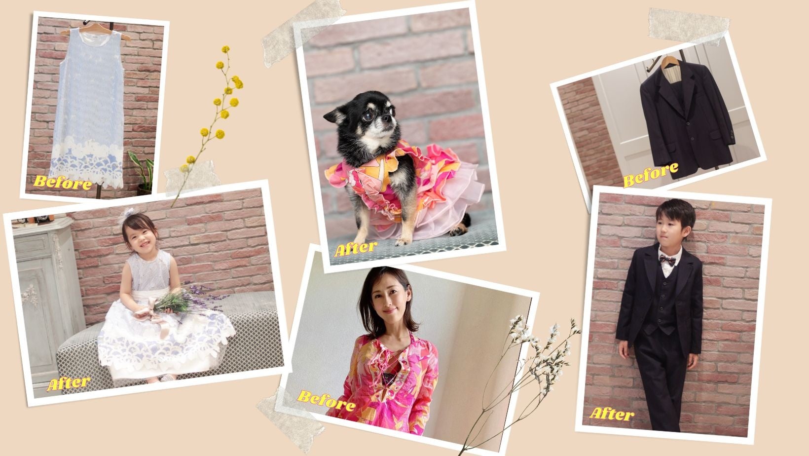 リメイクしたい洋服を「キッズドレス、キッズスーツ、ドッグドレス」にリメイクします。