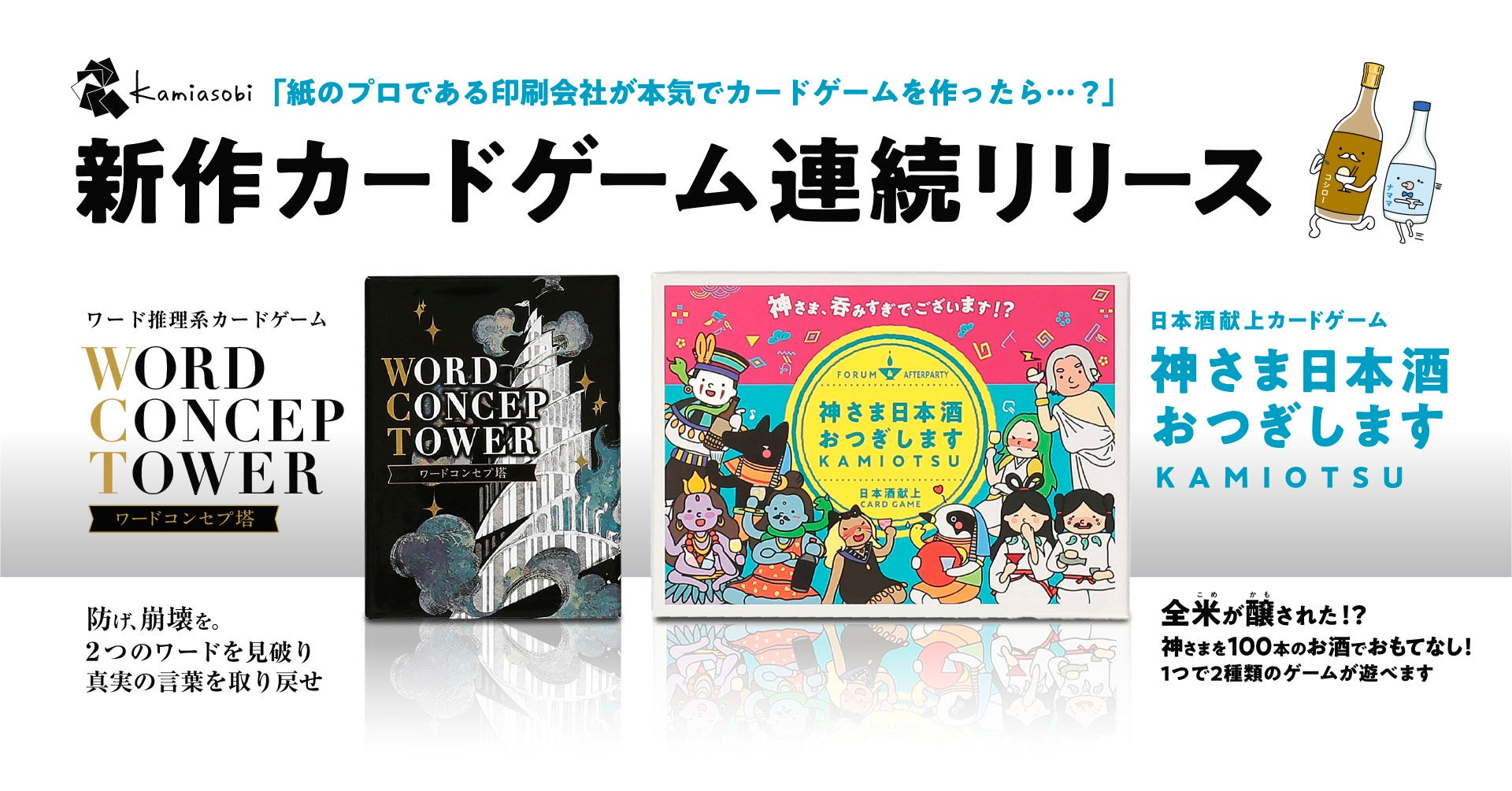 「数字」と「ワード」でカードゲーム界を席巻!?正反対の世界観で魅せる2つのゲーム「神さま日本酒おつぎします」「ワードコンセプ塔」を7月1日発売!