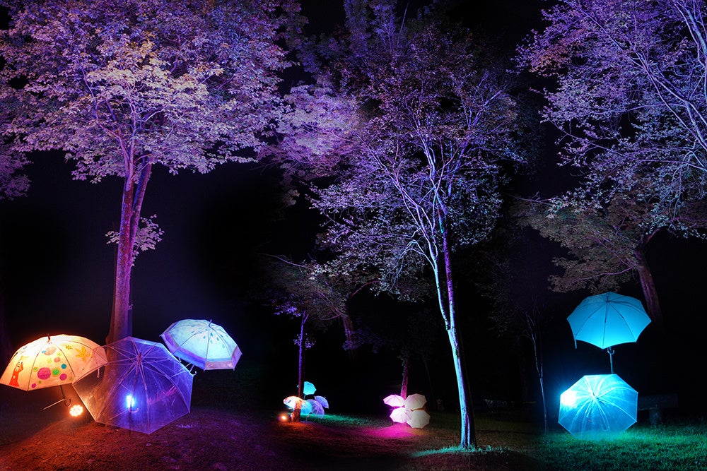 昼に傘に絵を描くワークショップを開催。夜には傘をライトアップさせる