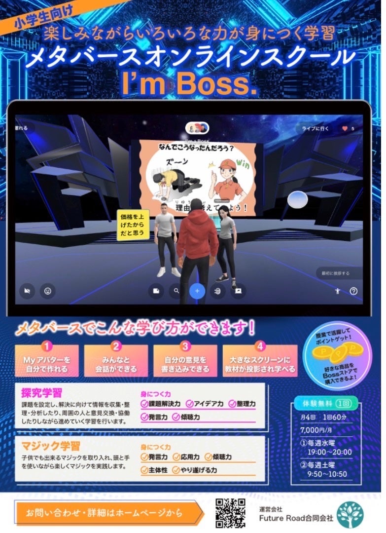 「すべての子供たちが自己肯定感に満ち溢れた社会をつくる」をミッションに掲げ、小学生向けオンラインビジネススクール「I’m Boss」を運営するFuture Road合同会社(所在地・東京都江東区東雲 代表・姜 貴成)は、これまでのZOOMレッスンに加え、子供たちがより楽しく主体的に取り組むための環境づくりとしてメタバースを使ったアクティブラーニングを導入。