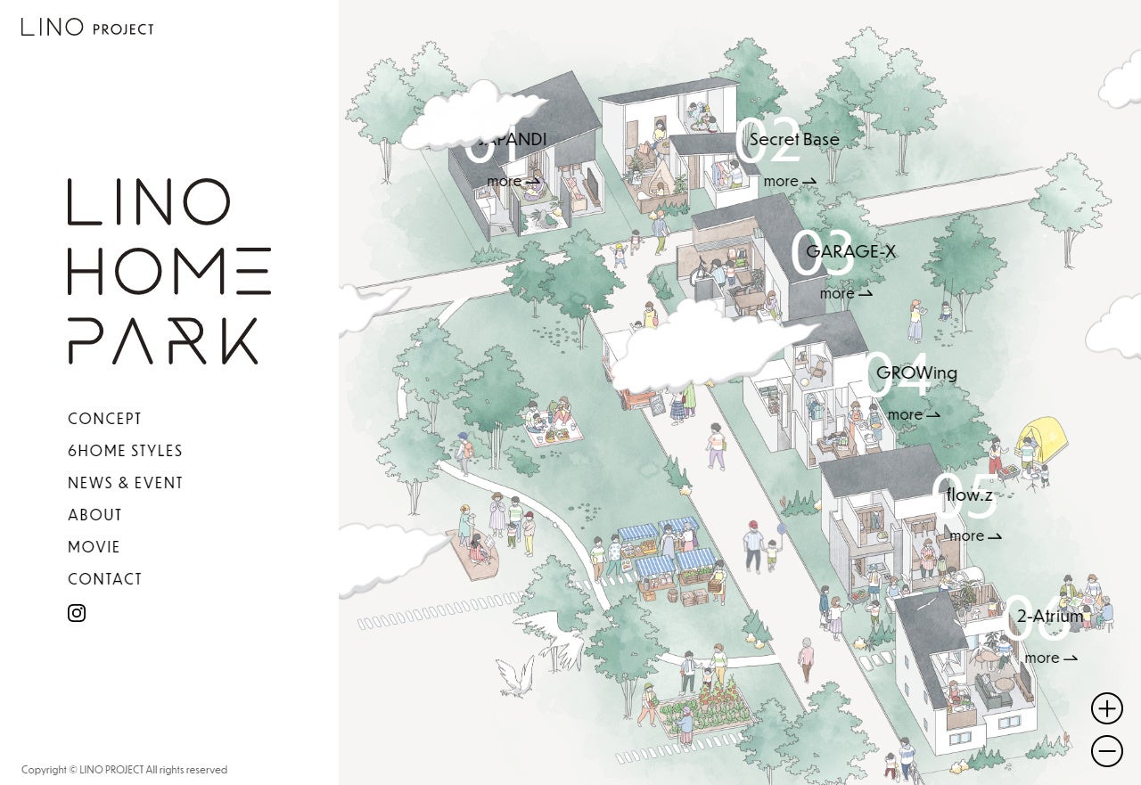 LINO HOME PARKは、経験豊富なLINO project(ライノ プロジェクト)のクリエイターがゼロから考案した、6つのライフスタイルでカテゴライズされた家を、一度にみることができる住宅展示場です。複数の企業が出展するような寄せ集めとは異なり、意図を持った企画型の住宅展示場となっています。