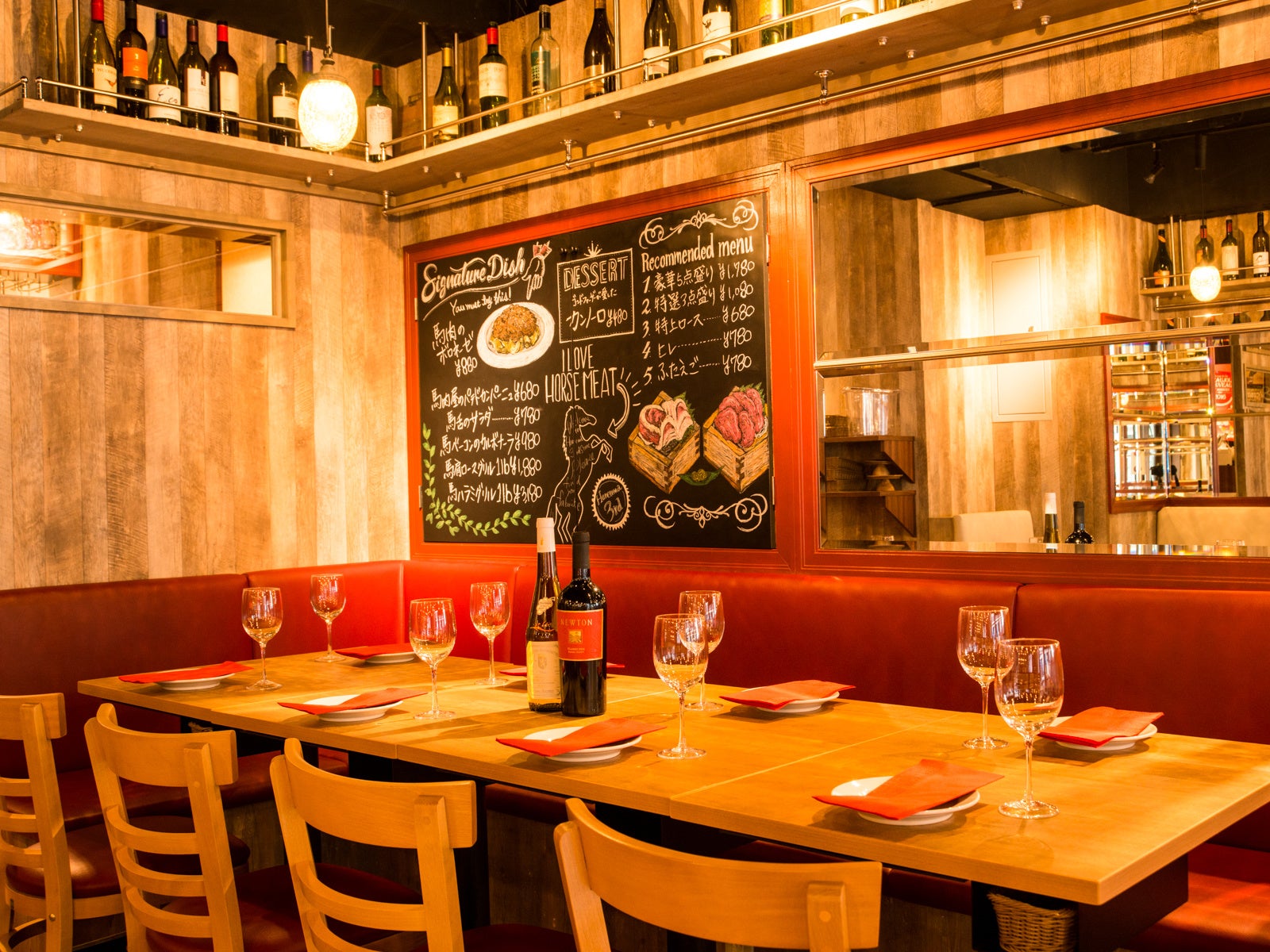 馬肉を中心とした肉料理と、数十種類のセレクトワインが楽しめる、