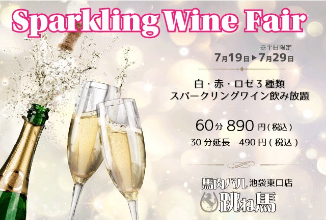 7/19(火)~7/29(金)平日限定!『スパークリングワイン60分飲み放題890円(税込)!!』馬肉バル跳ね馬池袋東口店で夏季限定のスパークリングワイン3種(赤・白・ロゼ)飲み放題フェア開催!