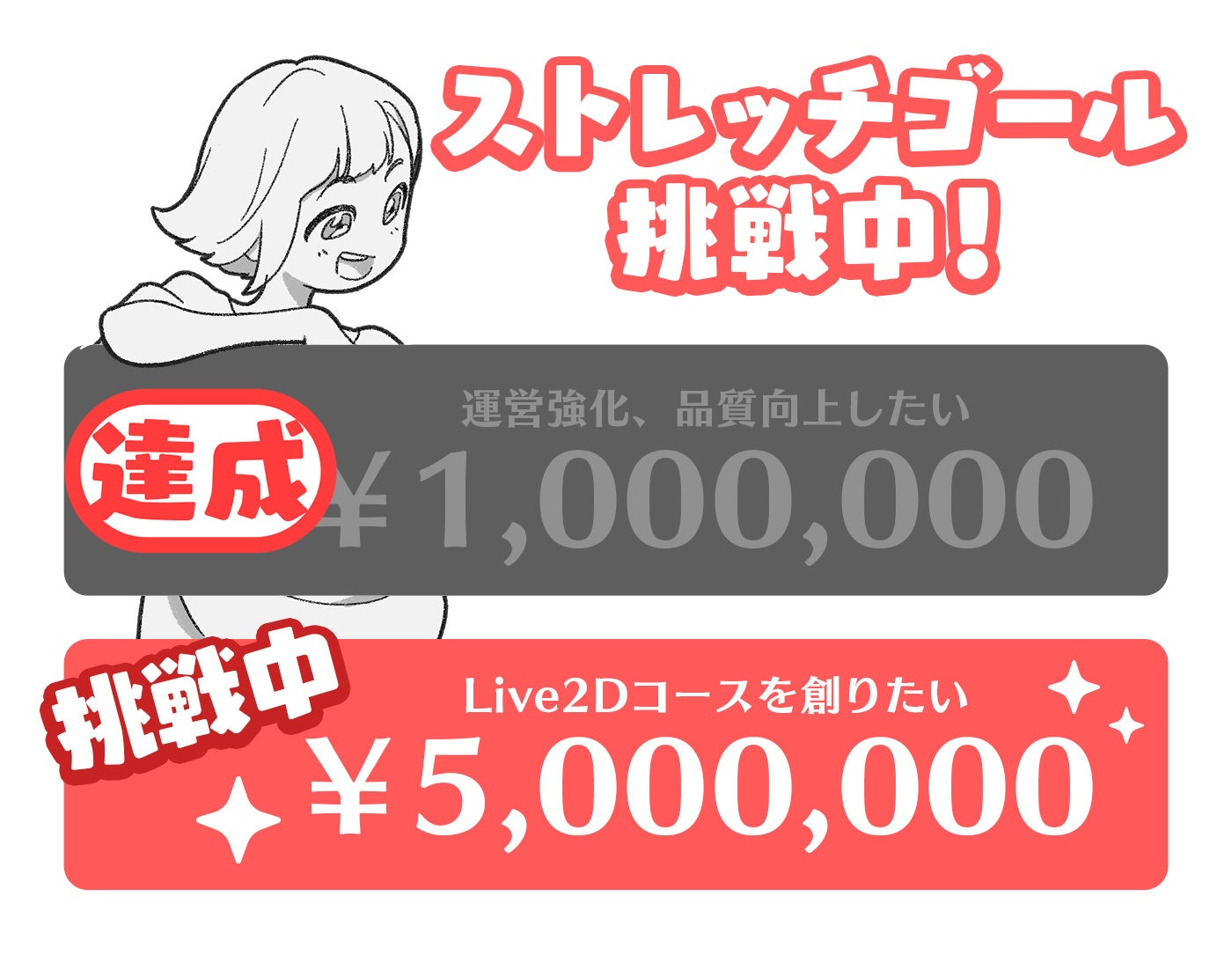 その中でもLive2Dの技術は今後のトレンドでもあり、将来性も高いことから重要なスキルの一つと考えており、一番最初に実装するコースとして元々計画しておりましたので、実装を早めるため、、次のストレッチゴールに設定を致しました。