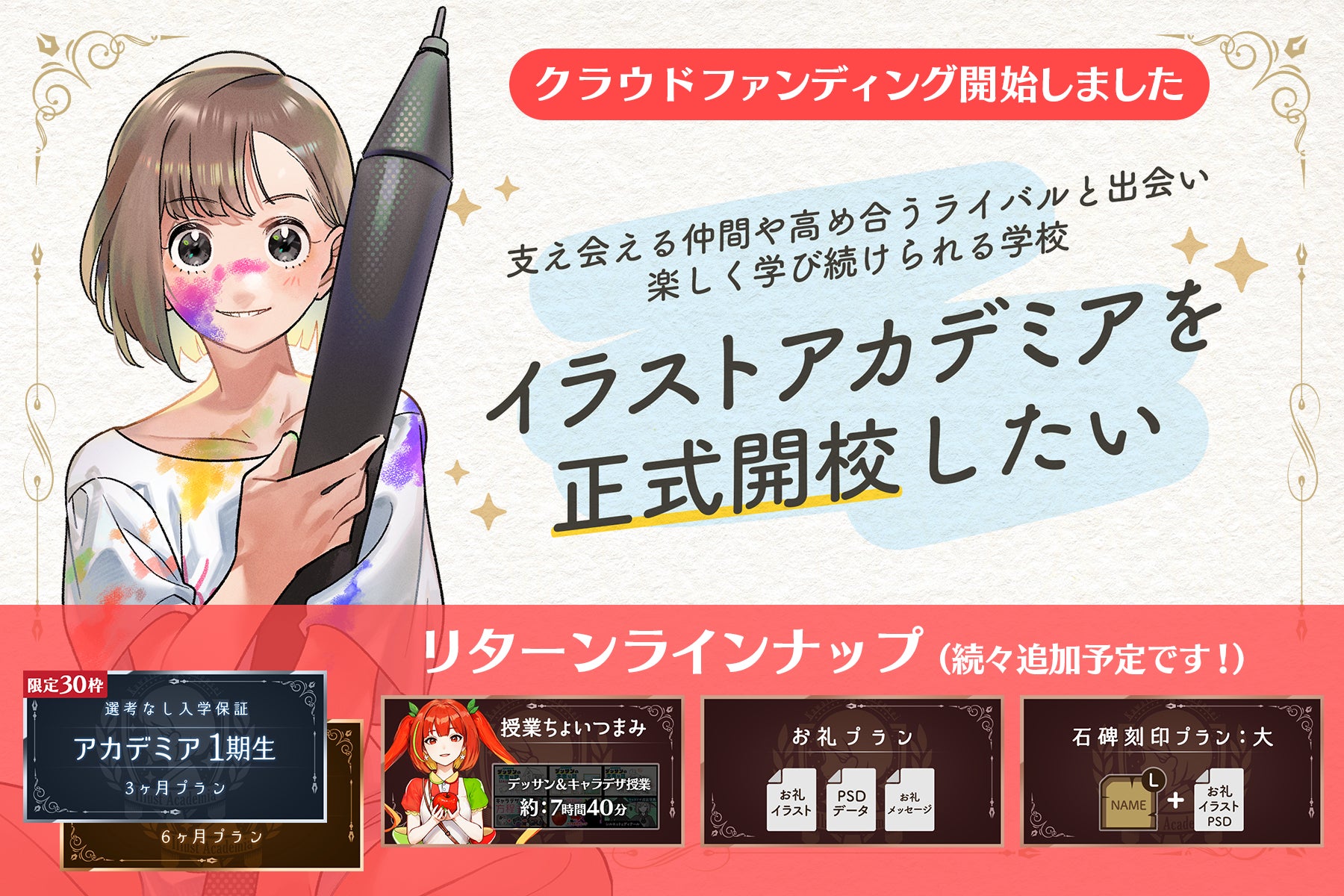 2024年1月よりイラストアカデミアをβテストとして運営してまいりましたが、5月の正式開校へ向けて運営力と品質強化のためクラウドファンディングを開始しました。