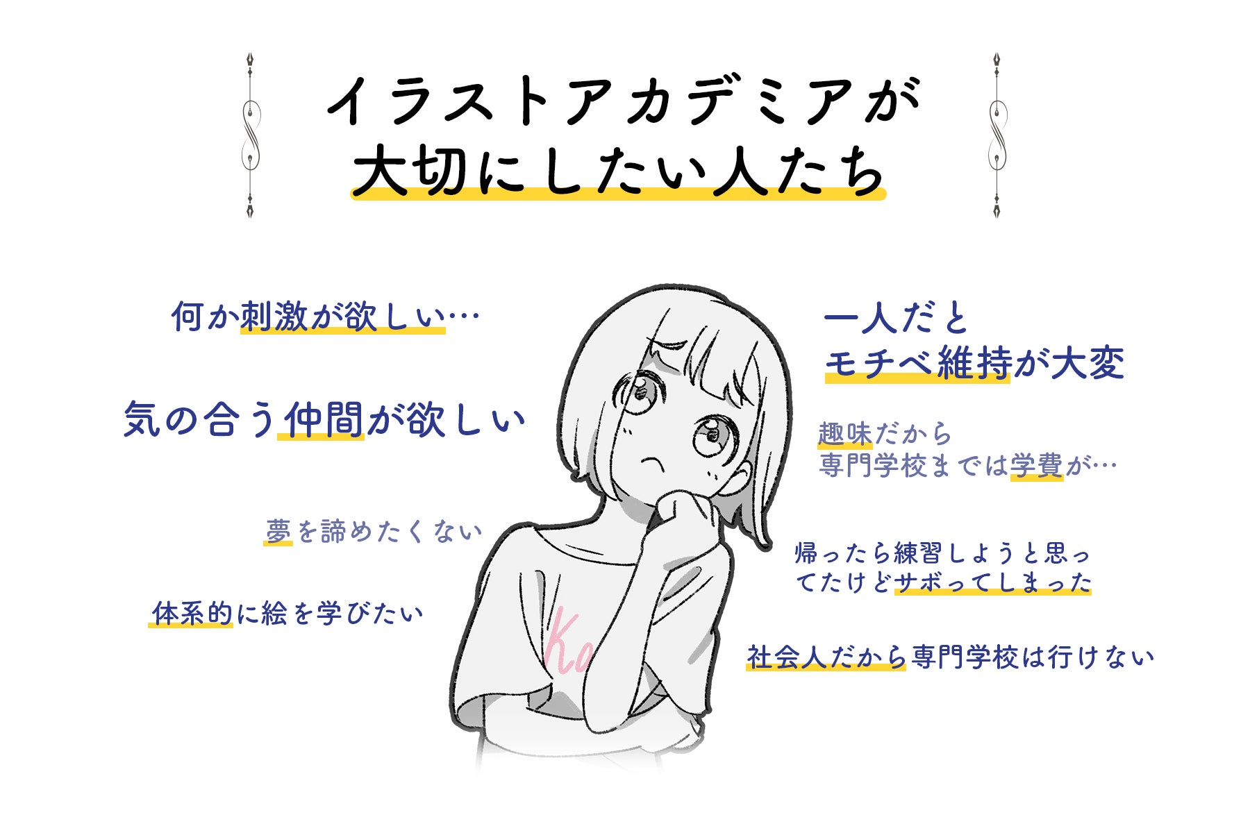 イラストアカデミアは、イラスト制作教材を提供するだけでなく「サボらずに取り組める環境」と「やる気が爆発するような環境」を用意するため、コミュニティを重視したオンラインスクールを目指しています。