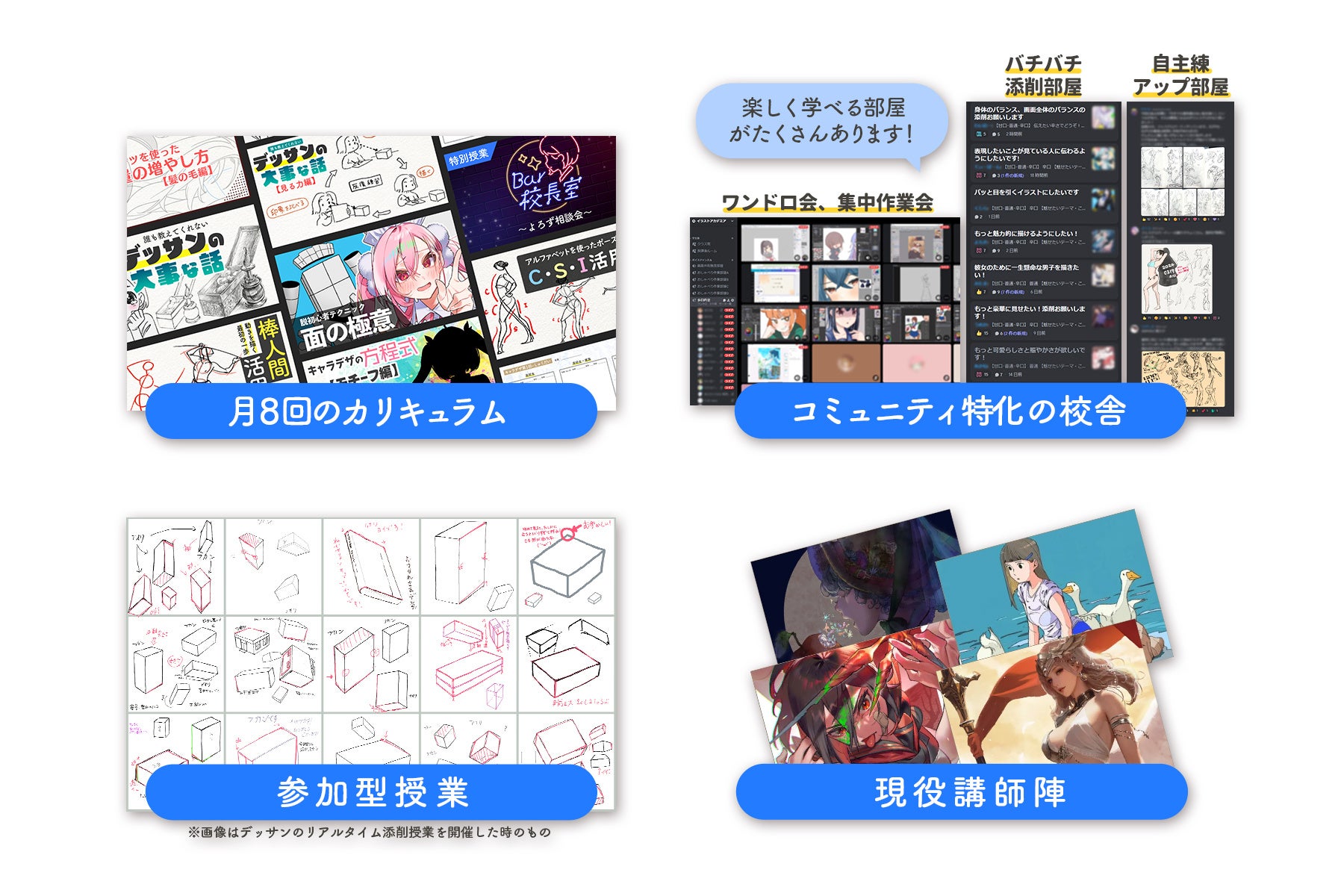 ◆基本カリキュラムとしてイラスト、キャラデザ、デッサン、ジェスチャードローイングの4科目で月8回の授業を開講。