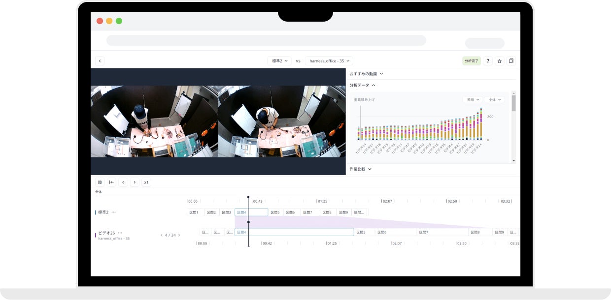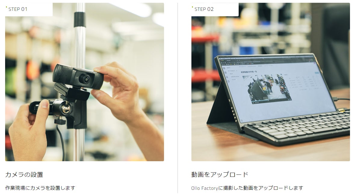 Ollo Factoryは、組み立て作業のような人の作業をAIによって自動で詳細に解析する画像認識ソフトウェアです。動画をアップロードし、1サイクルの開始点と終了点を指定するだけで、AIが動画に含まれるすべてのサイクルを自動で詳細に分析します。