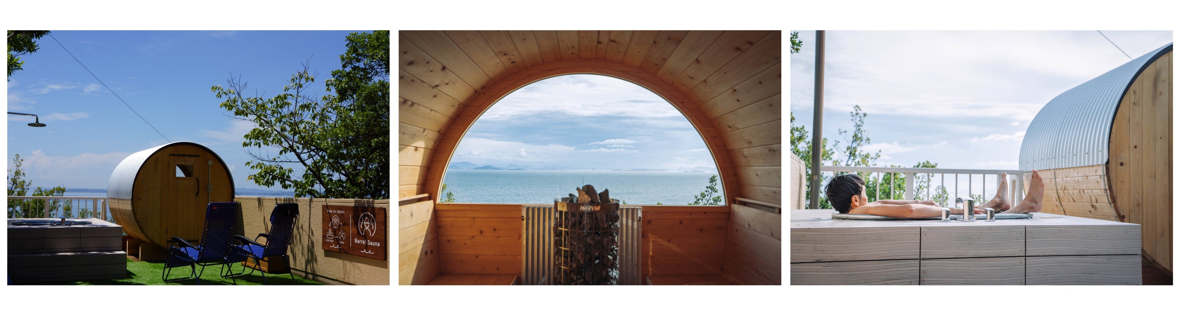 瀬戸内海を目の前にした施設の高台に設置されたオリジナルバレルサウナスペース。体験いただいたサウナ愛好者からは西日本一の絶景が眺められるサウナとのご感想を多数いただいております。ガラス面から覗く瀬戸内海の絶景は記憶に残るサウナ体験となります。
