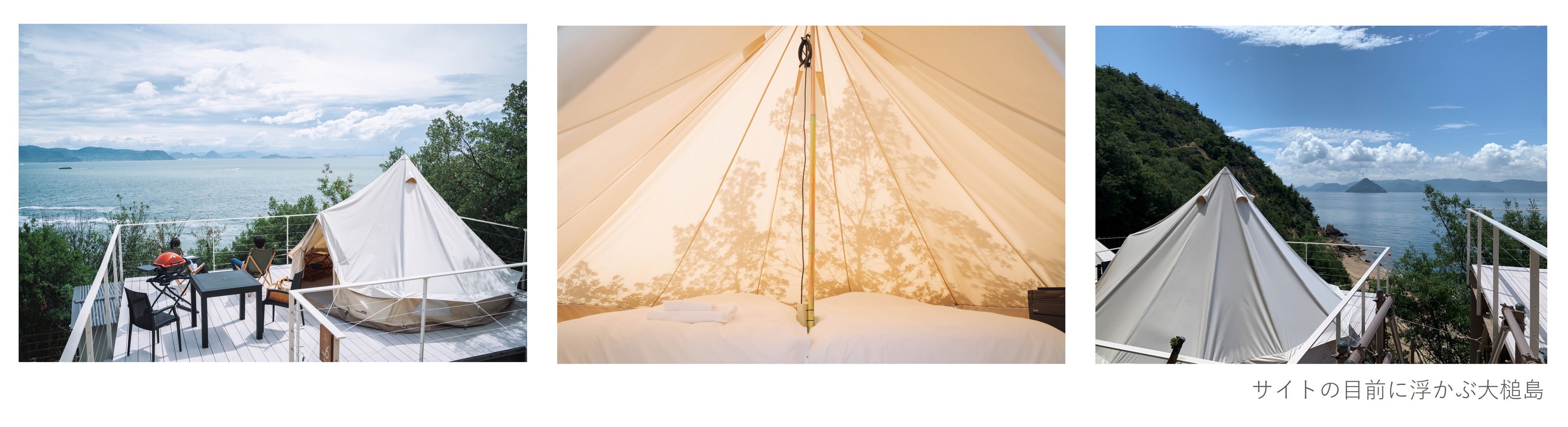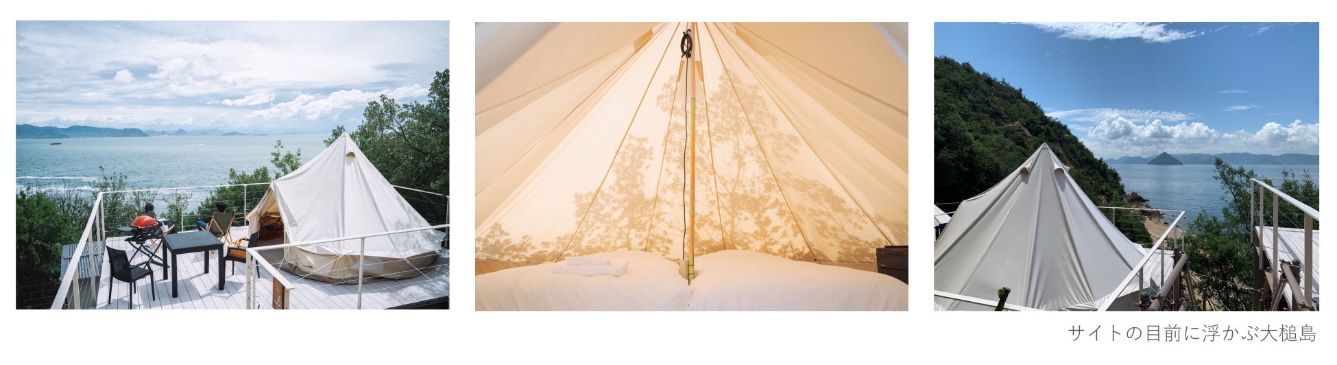 テントは施設の目前に浮かぶ岡山県と香川県の県境にある大槌島のシルエットから、それに模した可愛いベルテント(全室冷暖房完備)を採用。室内はシンプルでありながらも~SEA PICNIC~をイメージしたかわいい調度品を揃えております。