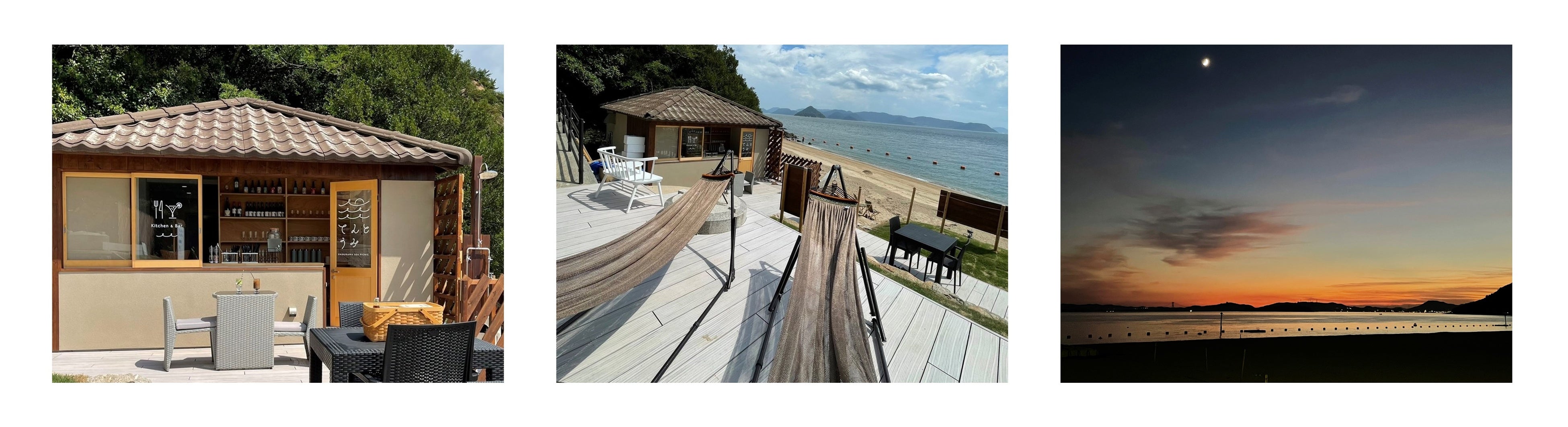 太陽が降り注ぐ気持ちの良い空の下で、「白砂青松100選」「日本の渚百選」「快水浴場100選」に選ばれる渋川海岸の海を目の前に、穏やかな瀬戸内海の潮風、この場所でしか見られない静かに沈んでいく美しい夕日や穏やかな波に触れ、都会の喧騒や忙しい日々を忘れさせてくれます。