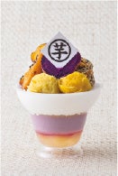 紅はるかと安納芋の焼きペースト、紫芋プリン、鳴門金時棒、胡麻さつまい もチップスなど、いろんなお芋が楽しめます。当店人気の贅沢「芋」パフェ を濃縮した人気メニューです。