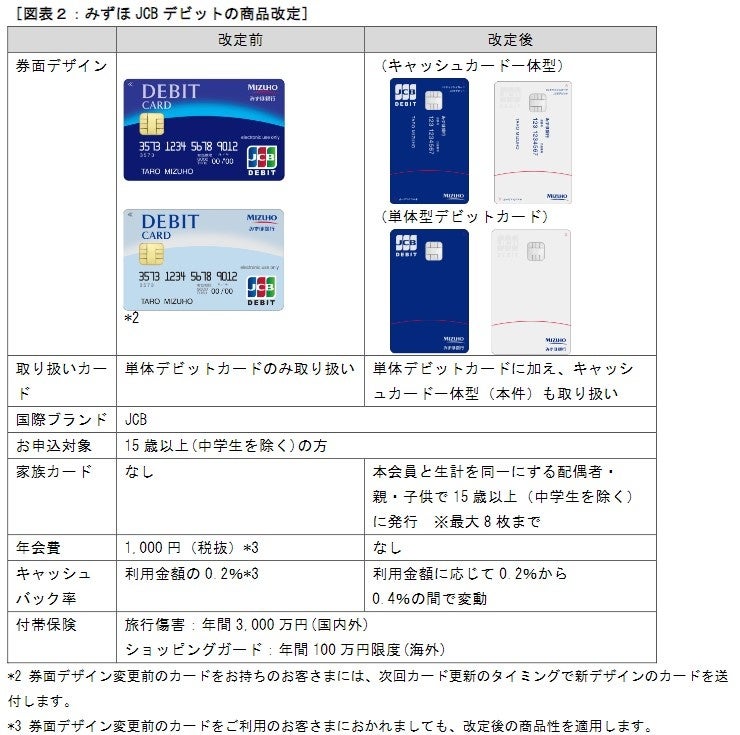 なお、本カードの取り扱い開始に併せて、既にサービス提供中の「みずほJCBデビット」につきましても商品性を図表2のとおり改定します。また、本カードの取り扱い開始と商品性改定を機に、新規入会したみずほJCBデビットをみずほWalletに連携したお客さまに最大で決済額の20%をキャッシュバックするキャンペーンを実施します(※2)。