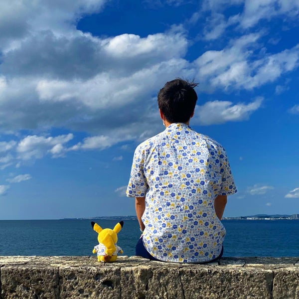 お連れ様のピカチュウかりゆしは、以前に購入したものなんですが、絶好の機会だと思い、着てきてもらった次第です。