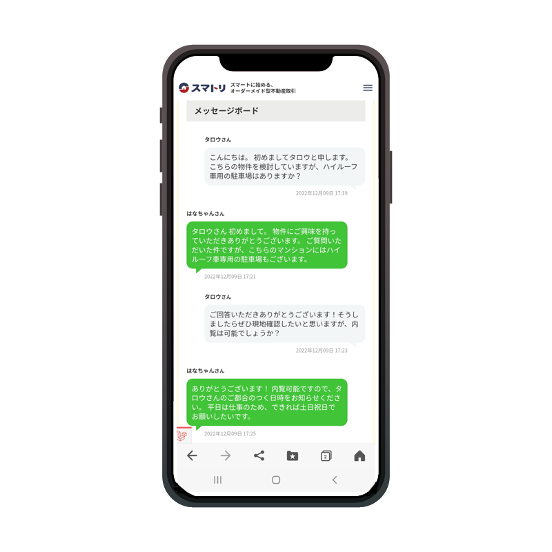 売主と買主がシステム上で商談メッセージのやり取りができるようになりました。もちろん相手方にメールアドレスなどの個人情報を知られることなく、システム上のチャット機能を通して行うことができます。