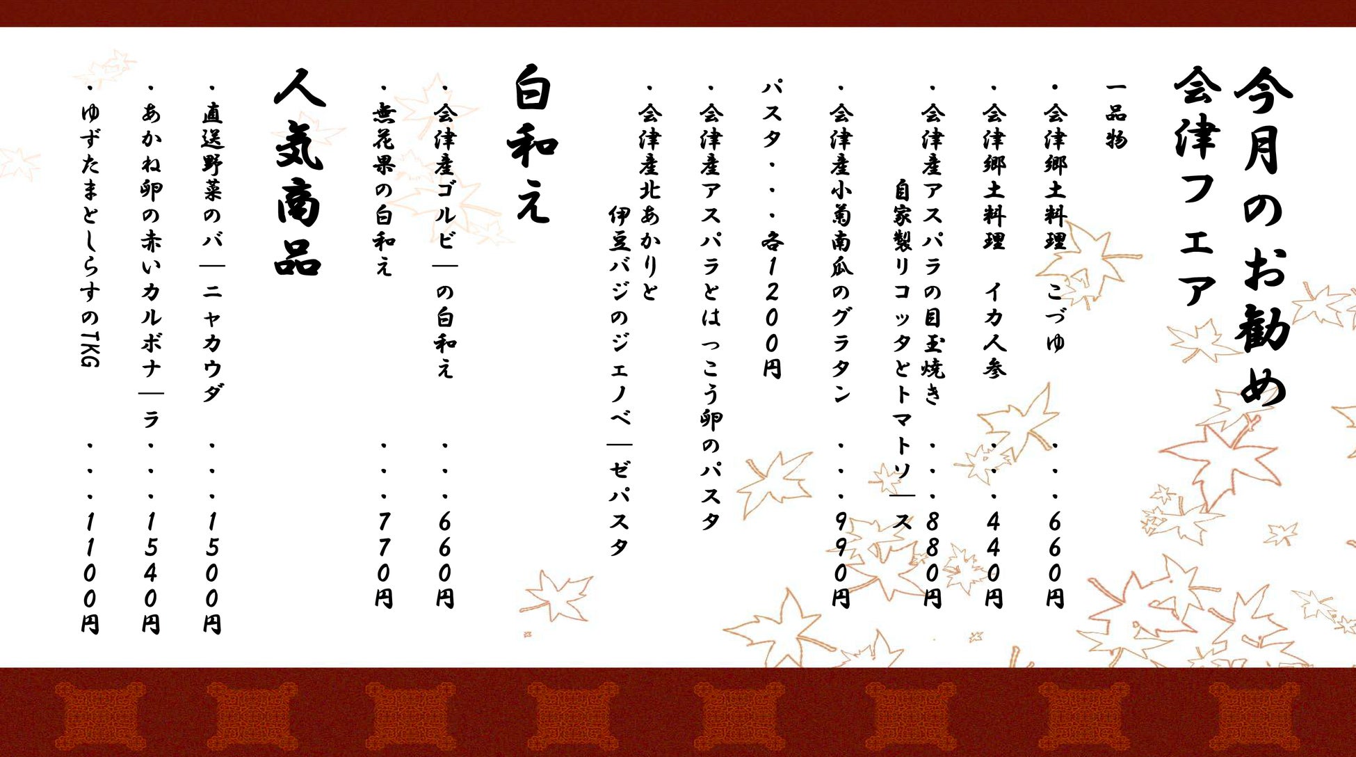 期間中は福島県会津地方の郷土料理および、会津産の直送野菜とフルーツを使ったお料理をご提供いたします。