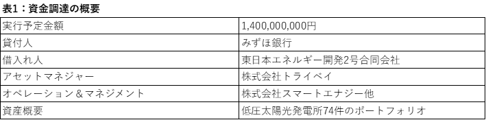 本件資金調達の概要は、下記表1のとおり、実行予定金額は1,400百万円、貸付人はみずほ銀行、借入人は東日本エネルギー開発2号合同会社、アセットマネジャーはトライベイでございます。