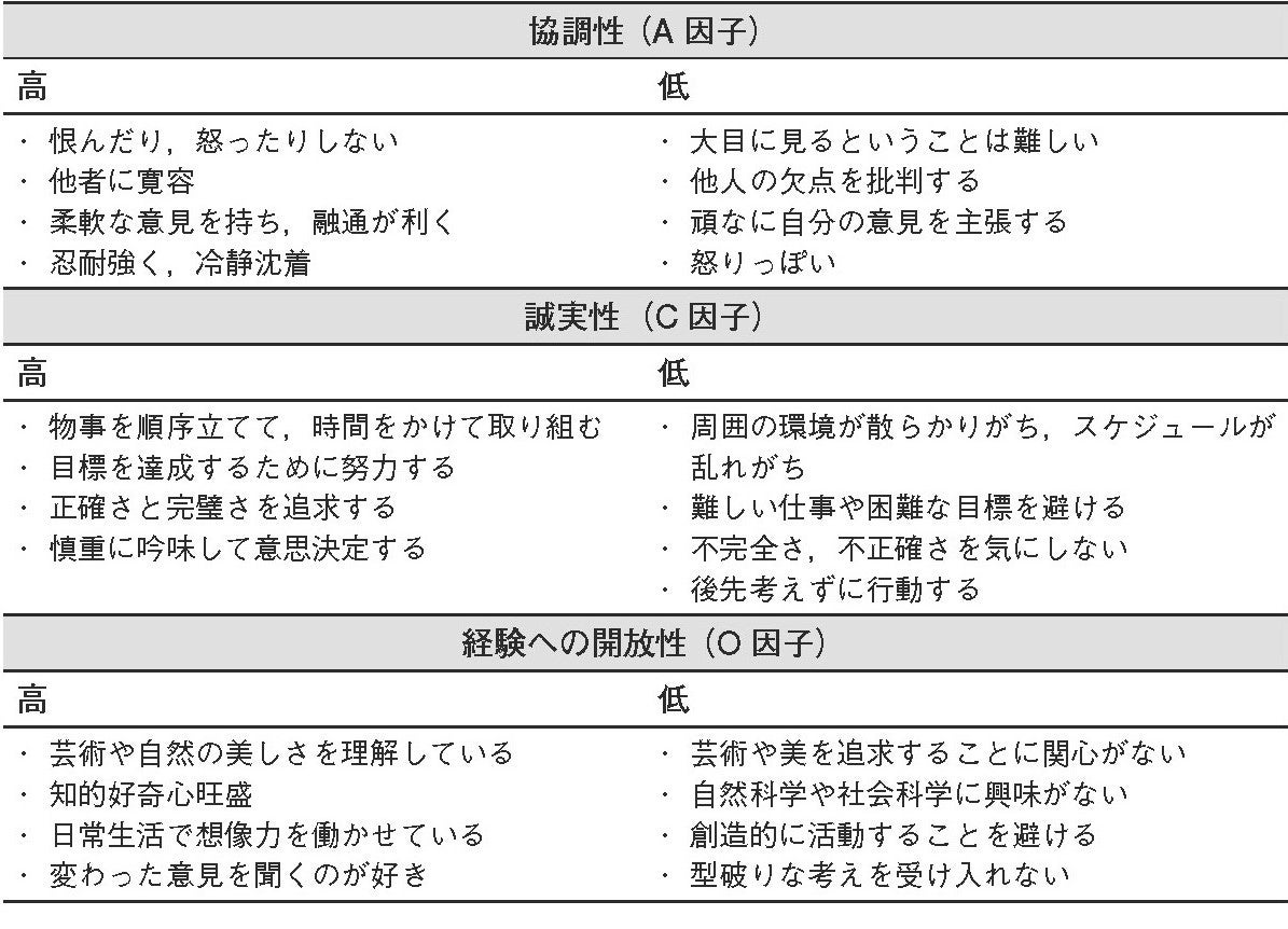 各因子の高低による特徴(第3章:HEXACO パーソナリティの六つの次元より)