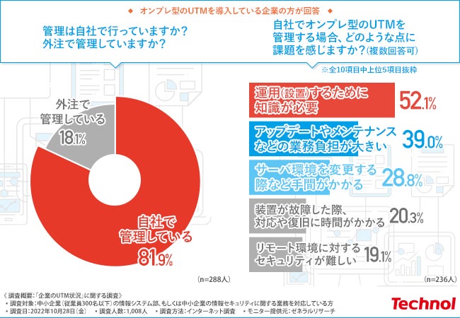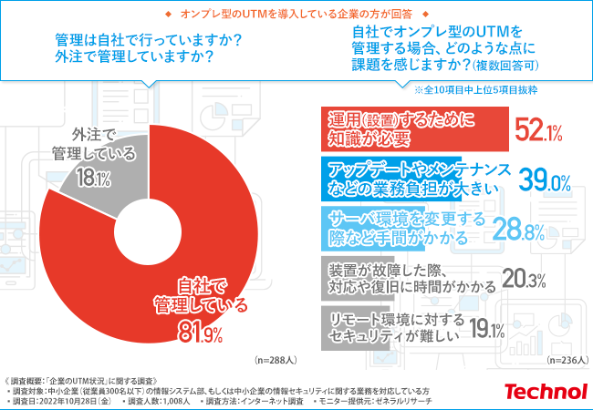 オンプレ型のUTMを導入している中小企業では、自社でシステム管理するケースが多く見られる一方で、専門知識の必要性や業務の負担増を課題と感じているようです。