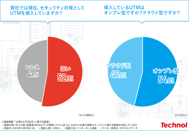 セキュリティ対策としてUTMを導入している中小企業は半数以上にのぼり、利用しているUTMのタイプはそれぞれオンプレ型とクラウド型に二分されています。