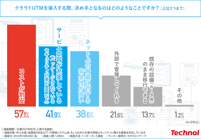 そこで、「クラウドUTMを導入する際、決め手となるのはどのようなことですか?(複数回答可)」と質問したところ、『コストが割安(57.1%)』と回答した方が最も多く、次いで『サービス内容が充実している(パッケージされているセキュリティ対策が豊富など)(41.9%)』『ネット上の脅威に対する安全性が高い(38.6%)』と続きました。