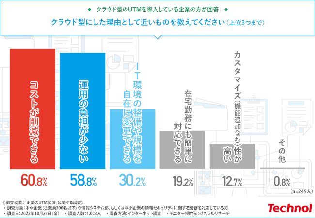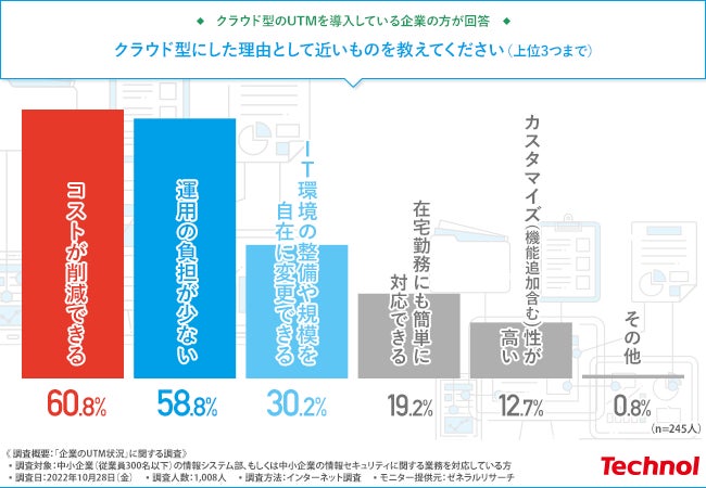 一方で、クラウド型のUTMを導入している中小企業は、コスト削減や利便性の高さからクラウド型を選んだようです。