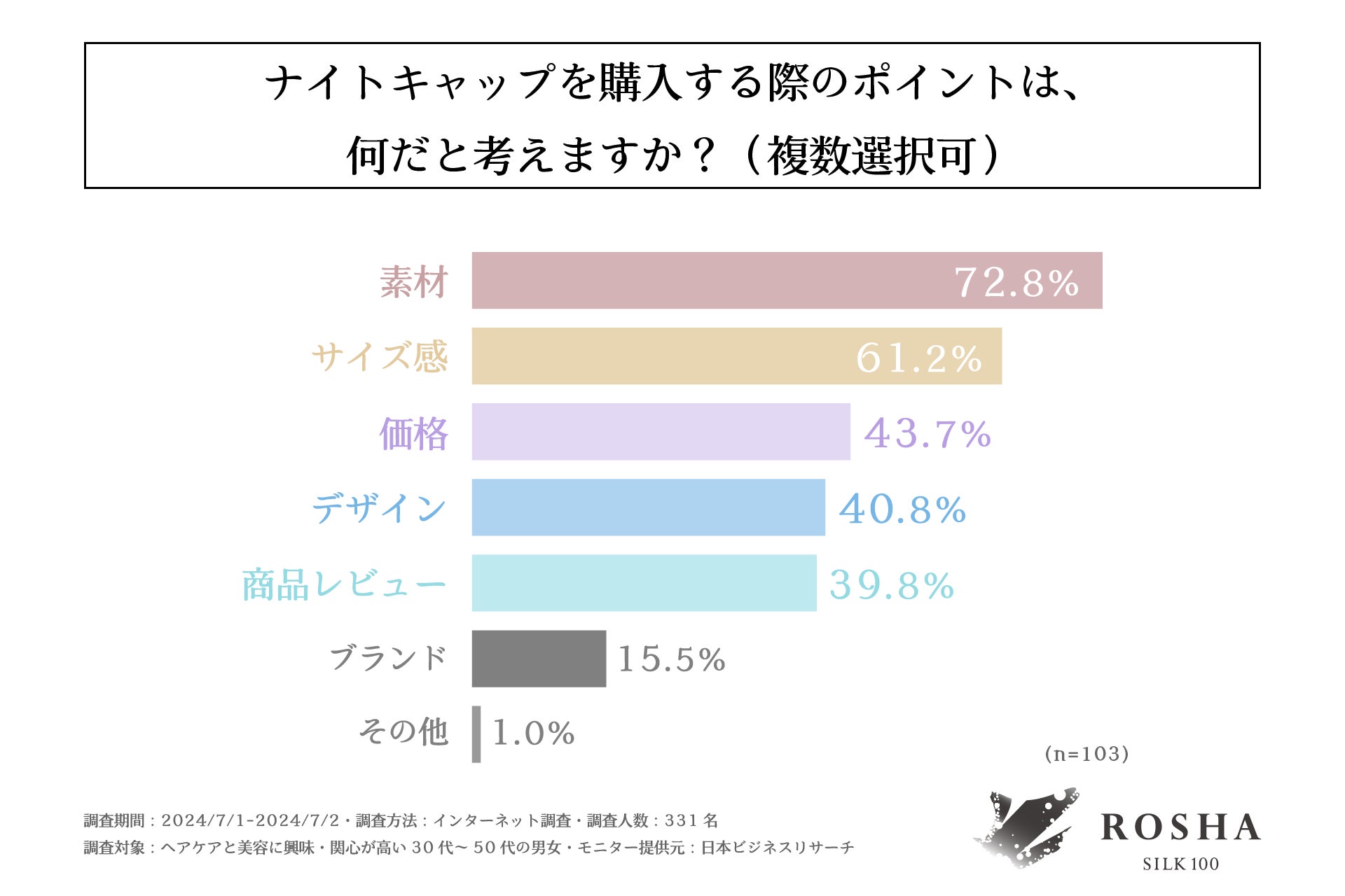 また、調査の最後にナイトキャップを使用したことが「ある」と回答された方に「ナイトキャップを購入する際のポイント」を訊く設問への回答では1位が「素材」で72.8%、2位が「サイズ感」で61.2%、3位が「価格」で43.7%という結果となりました。この結果からナイトキャップ選びにおいては、価格よりも素材やサイズ感が重要視されていると明らかになりました。