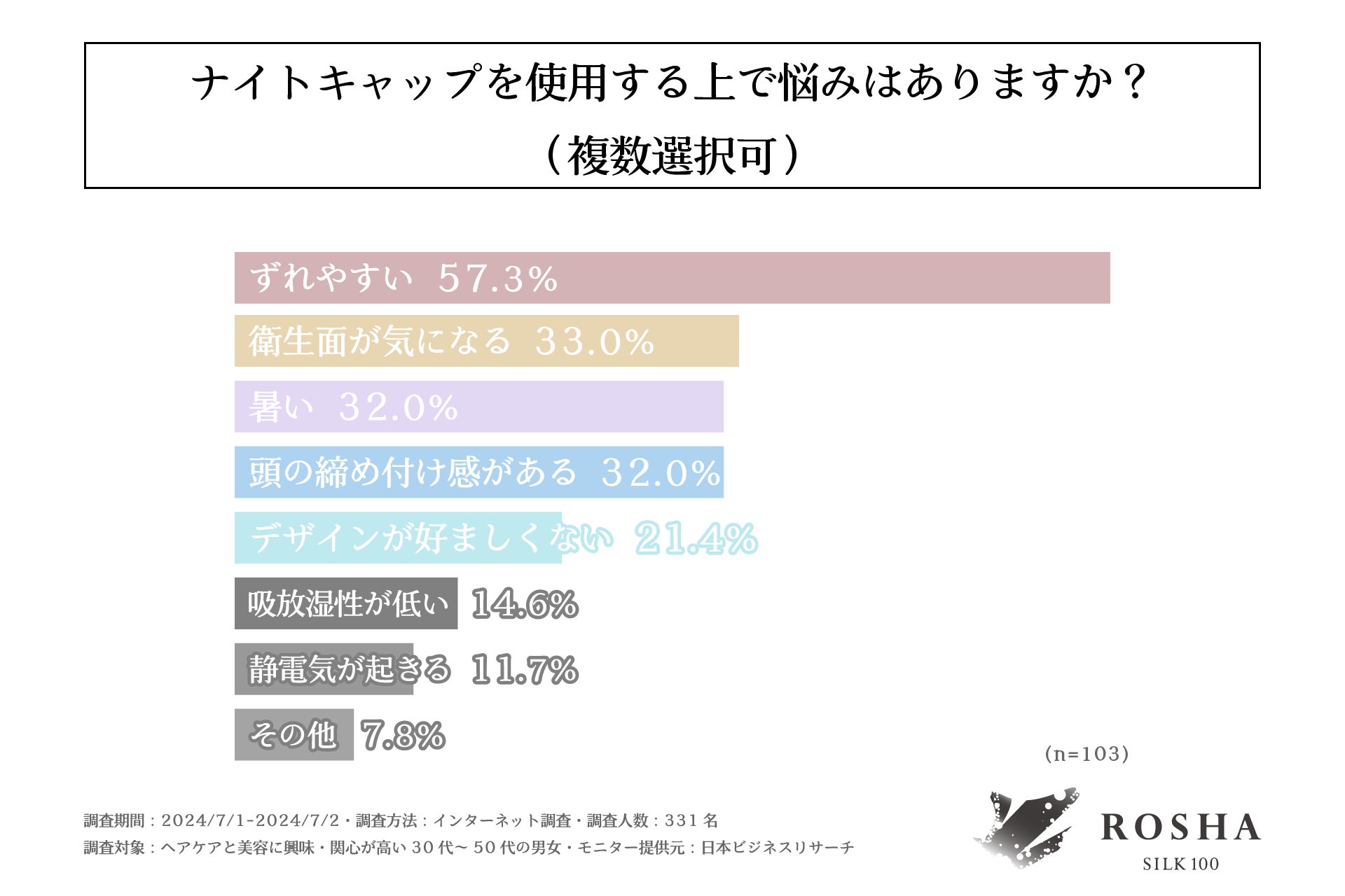 また、ナイトキャップを使用したことが「ある」と回答された方に「ナイトキャップを使用する上での悩み」を尋ねる設問への回答では、1位「ずれやすい」で57.3%、次いで2位「衛生面が気になる」で33.0%、3位が同率で「暑い」と「頭の締め付け感がある」で32.0%という結果になりました。前項の質問から、髪のケアのために使用されている方が多いという結果が出ましたが、ずれてしまうとその効果が出にくくなってしまうことや暑いという要因から、夏などは使いづらさがあるという事実が浮き彫りになりました。