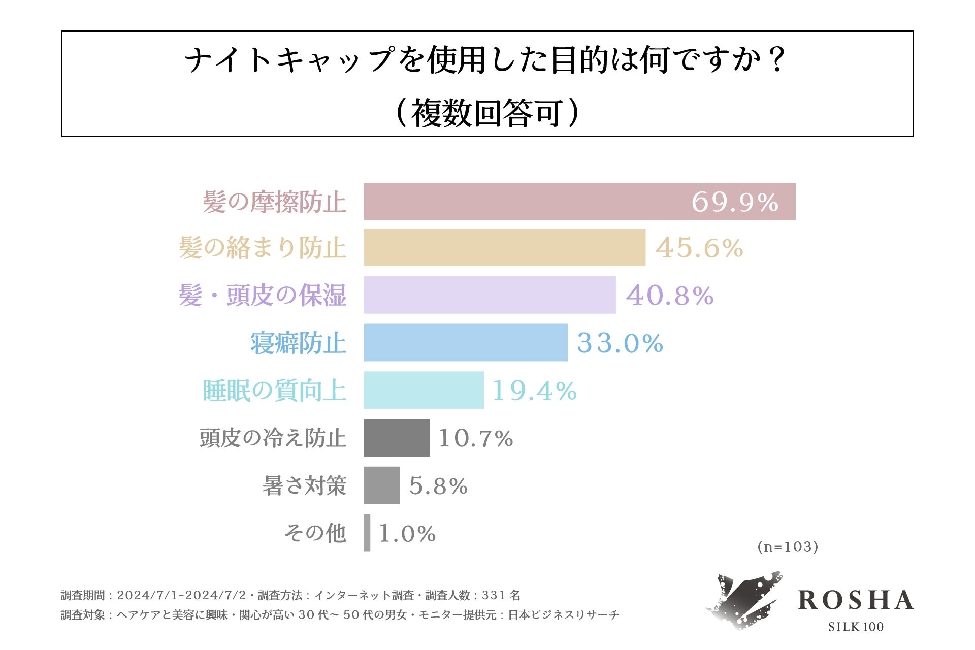 次に、ナイトキャップを使用したことが「ある」と回答された方に「ナイトキャップを使用した目的」を問う設問の回答では、1位「髪の摩擦防止(69.9%)」、2位「髪の絡まり防止(45.6%)」、3位「髪・頭皮の保湿(40.8%)」となり、髪のケアのためにナイトキャップを使用しているという回答が上位を占める結果となりました。