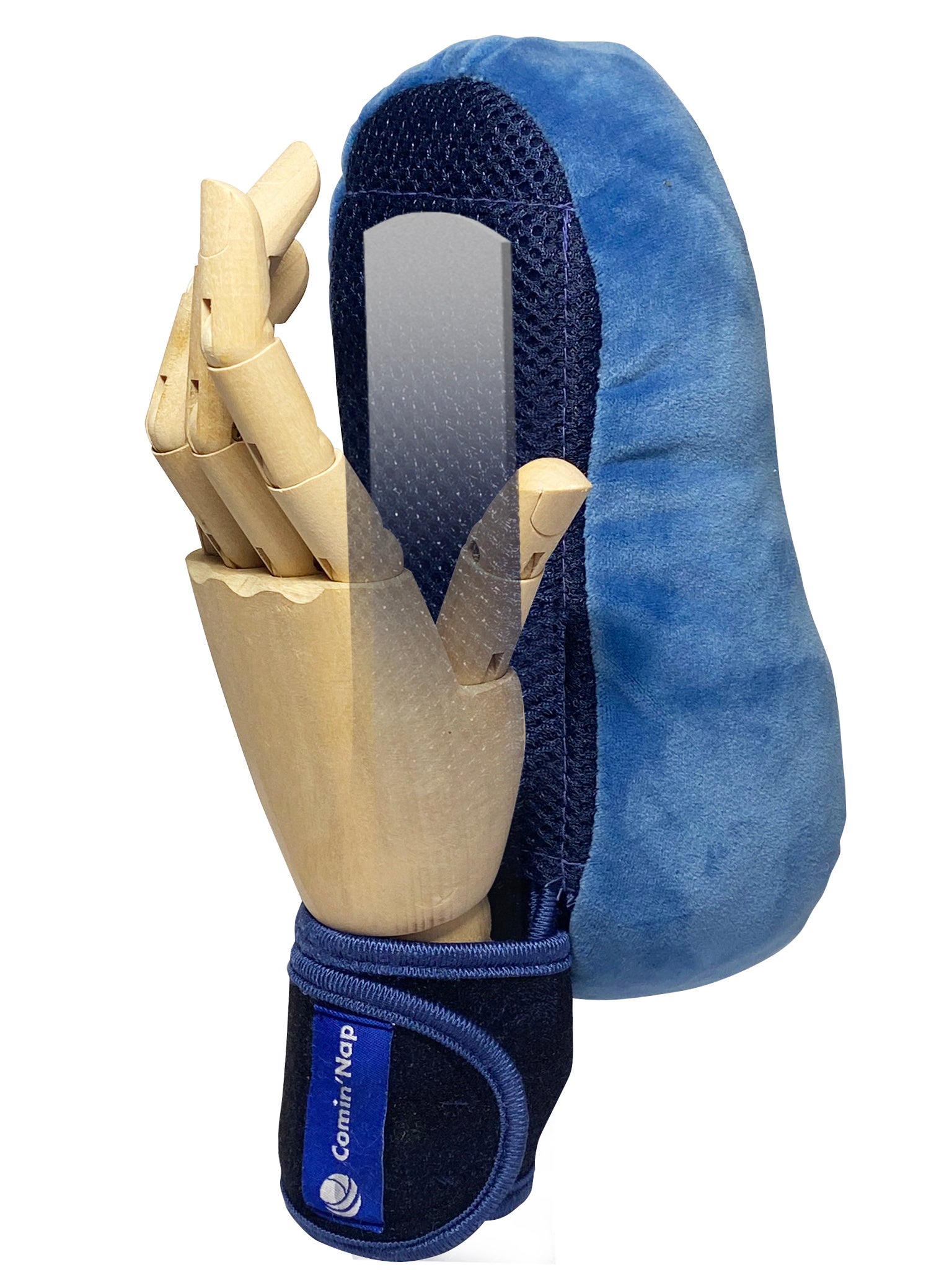 長距離バスや飛行機でのレッドアイフライトなど、座ったまま眠る場合でも、より良い睡眠を求めたくなるのは自然なことです。座ったままの睡眠が困難な理由に、「自分の頭を支えること」が難しいということが挙げられます。トラベルピローを利用される方も多いのですが、満足されている人ばかりではなさそうです。いま主流のトラベルピローはU字型のクッション材を首に巻き付けるタイプです。素材は硬い方が頭を支えやすいのですが、しっかりした素材であればあるほど、首を絞め付けられるような違和感を覚えてしまいます。逆に、柔軟な構造だと肌触りは良くなりますが、頭部を支えられません。『てのひら・Comin‘ナップ®』は、首に何も巻き付けず、掌(てのひら)の上の『ふんわりピロー』で頭部を支えて眠ります。内蔵の『クッションプレート』により「梃子(てこ)の原理」で頭の重さを分散し、素手や従来のトラベルピローでは難しかった自然な姿勢での睡眠を実現しました。てのひらで頭を支えるという当たり前の姿勢なので、今までなかったことが不思議になるアプローチです。この新しい発明「梃子(てこ)の原理をつかった携帯まくら」の特許を出願し、製品化したのが『てのひら・Comin’ナップ®』なのです。(特許出願番号2022-208775)