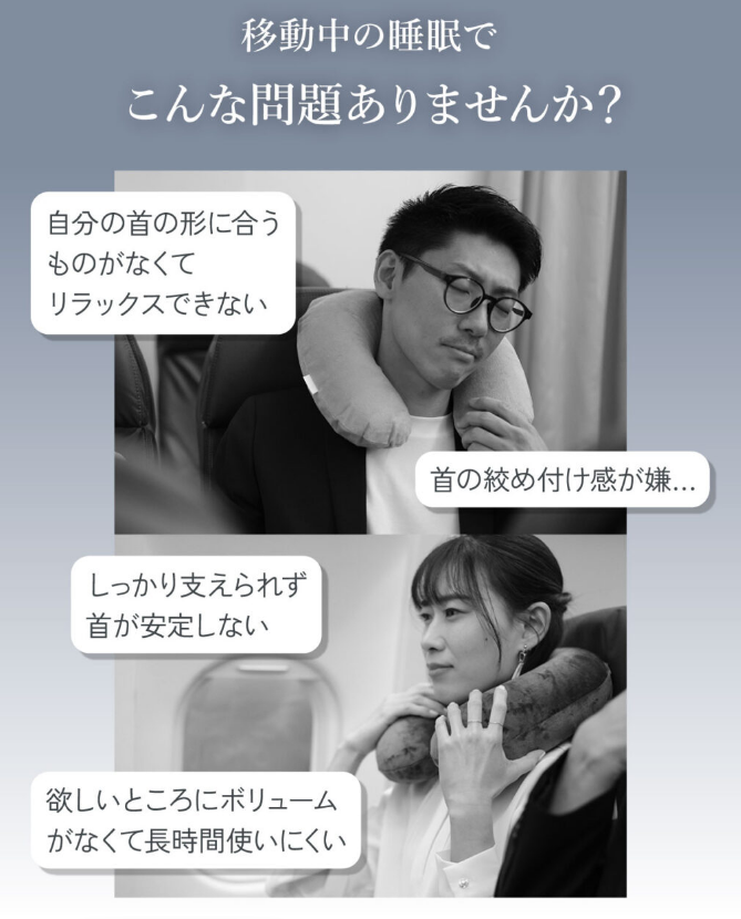 巣ごもり生活から解放されつつある今、遠方への旅行を検討されている方も増えてきました。この商品は、車中泊、機内泊など座ったままの睡眠に貢献します。「クッションプレート(=板ばね)」と「ふんわりピロー(=枕)」で、今までのトラベルピローでは難しかった『クッション性』『しっかり頭を支える』『首元すっきり』を同時に実現しました。Makuake掲載ページ https://www.makuake.com/project/cominnap/ ※)2022年12月、特許庁データ調べ。梃子の原理を使った装着する枕として世界初 特許番号第6746071号 特許出願番号2022-208775