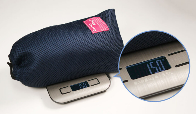 大きな『ふんわりピロー』を装着しても重さは150g弱と軽量。各パーツは取り外しが可能で、『携帯袋』はB5ほどの大きさ(18×27センチ)です。