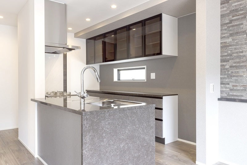 魅せるキッチンスペースを提案。天然石の風合い、インテリアのようなテイストがLDKの上質感を高めていく。ホームパーティ向きのオシャレなキッチン。